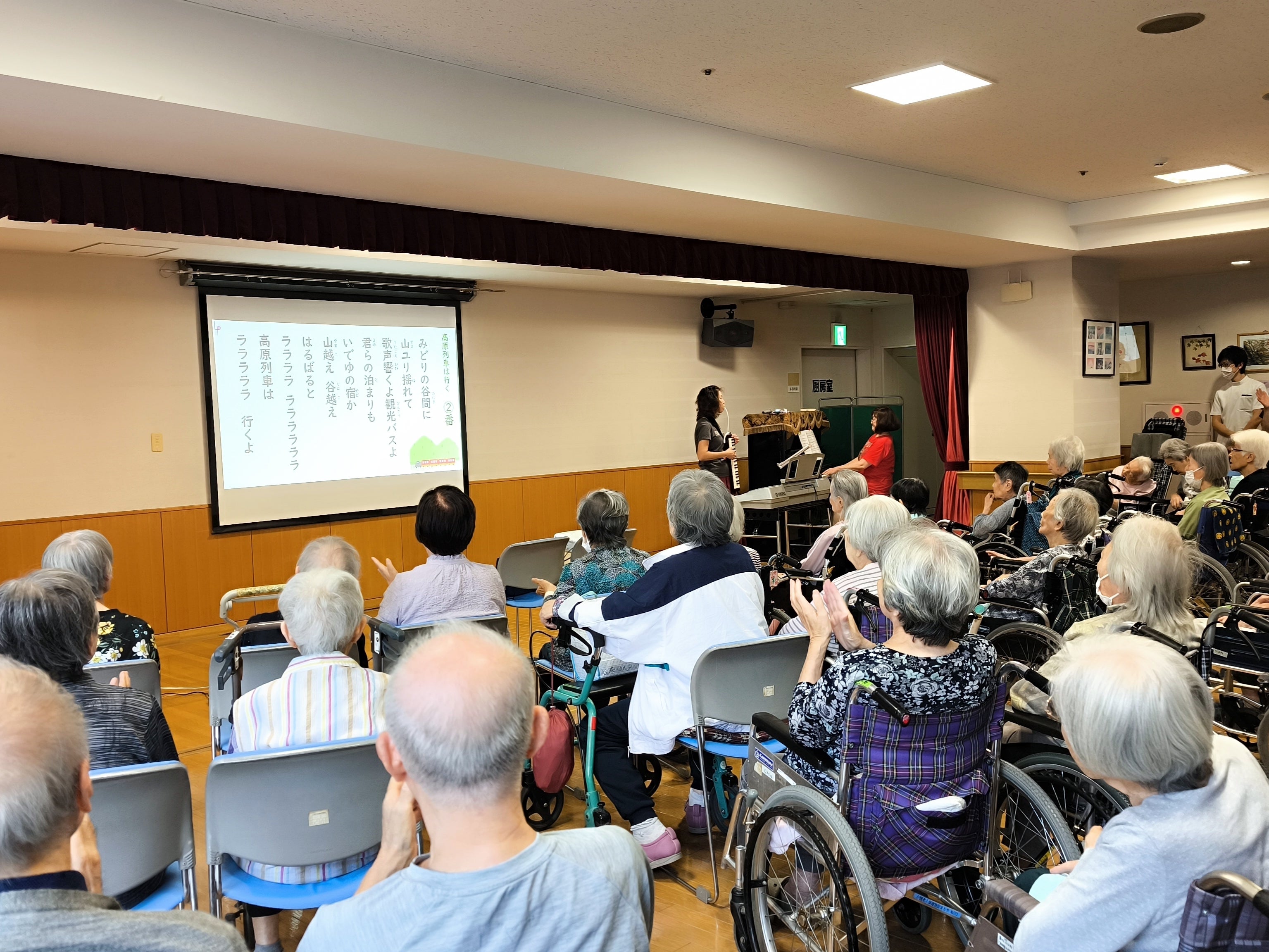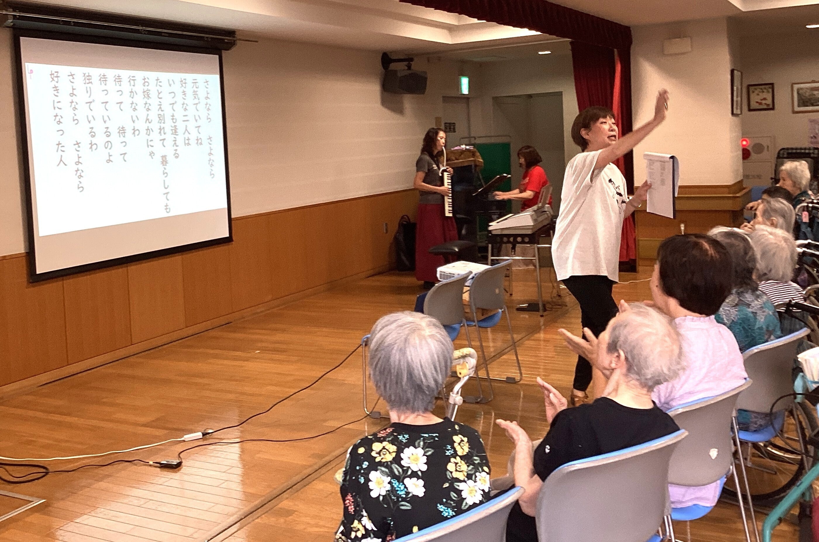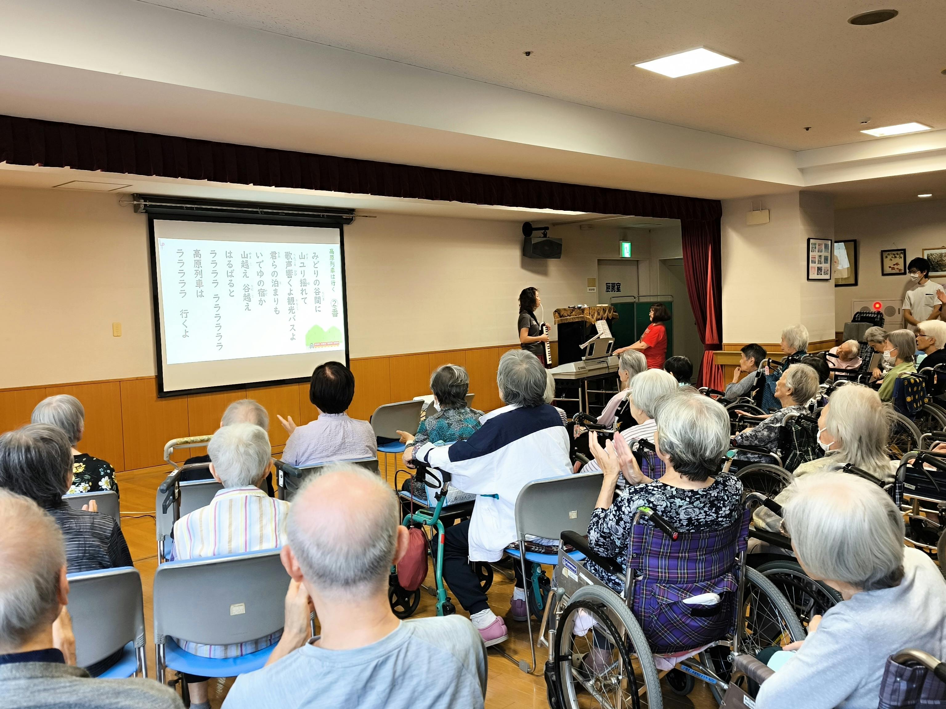 どの曲もお年寄りの心に深く刻まれた歌ばかり。歌いながら涙ぐむ方や、静かに目を閉じて聴き入る方の姿も見られ、会場全体が懐かしさとあたたかさに包まれました。