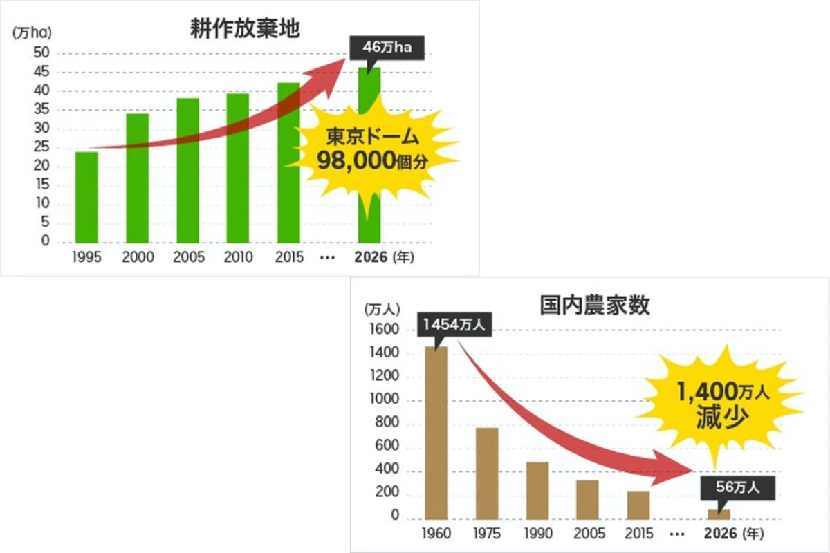日本の農業は壊滅的状態です。食糧自給率は低下の一途を辿り、国内の耕作放棄地の面積は2026年には46ヘクタール、東京ドーム98,000個分になると言われています。