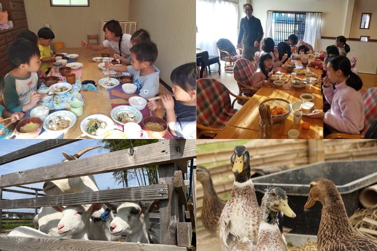 自分たちで作ったお米は子どもたちのオーガニック給食に。烏骨鶏・ヤギ・合鴨など動物たちと触れ合いながら、賑やかに過ごしています。