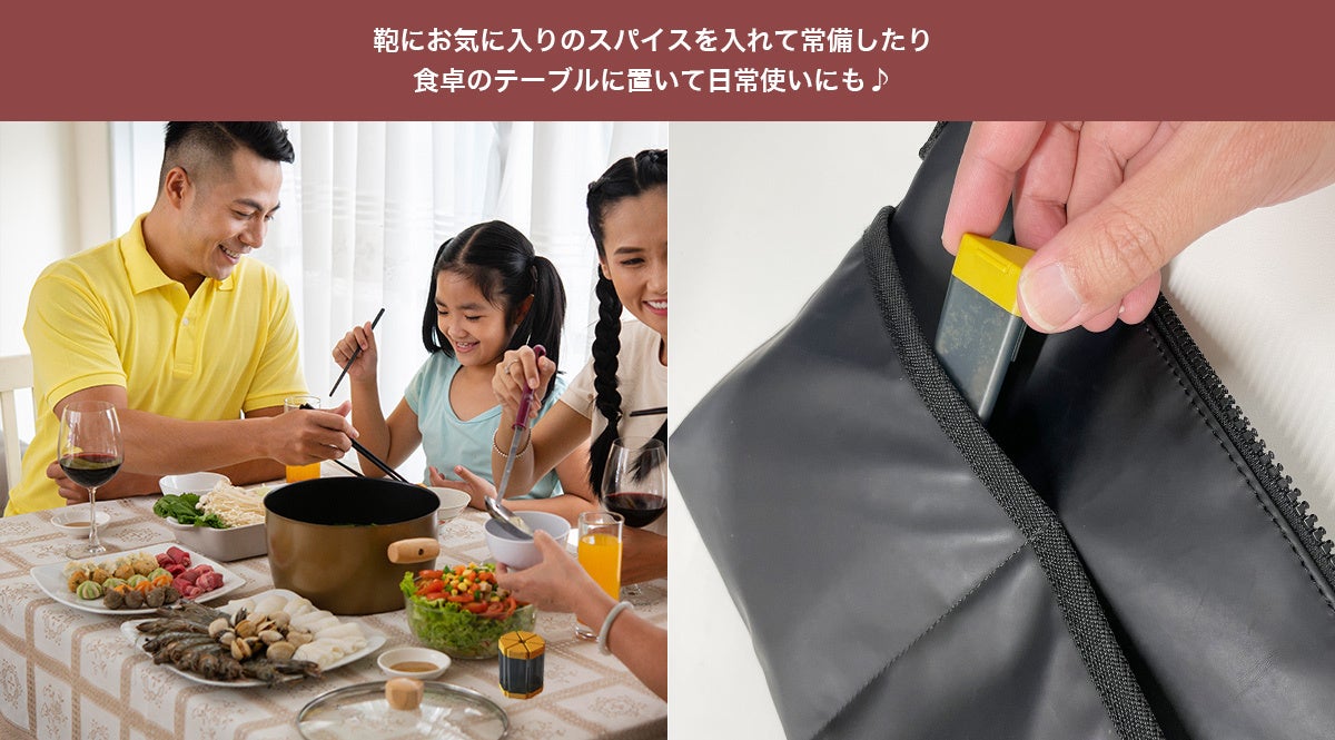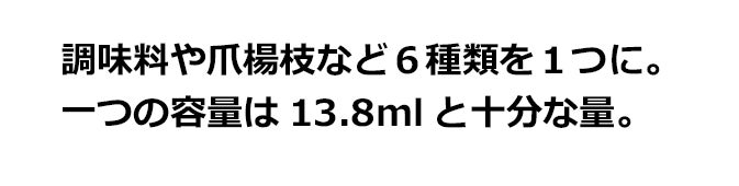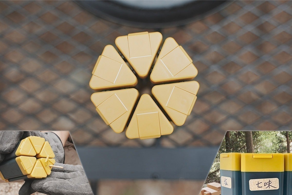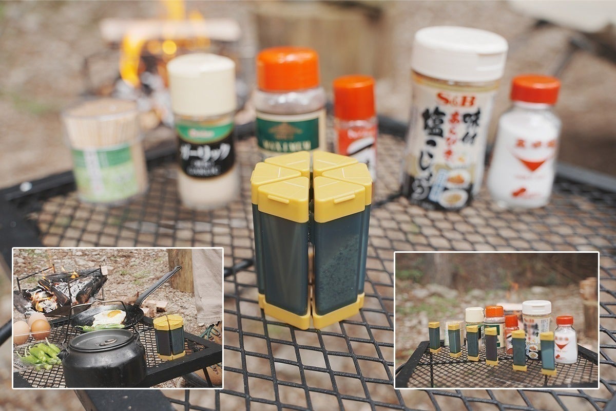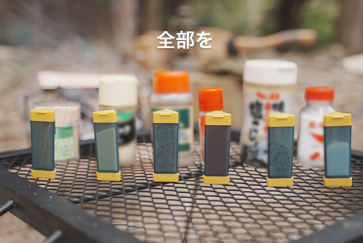 「かさ張るから使い切れるぐらいの量の持ち運びできるケースがないかな…」と思う機会が多く、既製品から探したのですが内容量が多すぎたり、1個、2個しか収納できない事で結局満足いくものがなく、この形なら一気にたくさんの調味料・スパイスや爪楊枝なども詰めて持ち運びできるのでは!?とアイデアが浮かび、知り合いの樹脂成形会社さんに問い合わせするところから始まり、試行錯誤の上に開発した商品です。