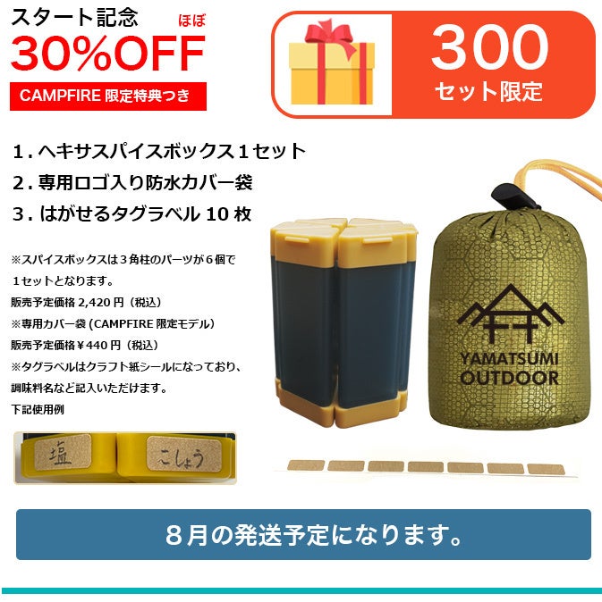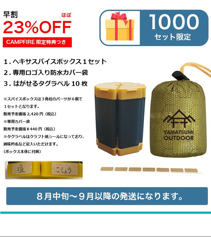2023/08/01 14:47皆様こんにちは、ヤマツミアウトドアギアを運営しております寺岡です。昨日23:59に、ヤマツミ初のクラウドファンディング「ヘキサスパイスボックス」が終了し114名もの方からのご支援をいただき、無事に目標達成にて終えることができました。ヤマツミとしても私個人としても始めてのクラウドファンディング、かなり不安と期待が入り交じってのスタートでしたが、こうして終えてみると、多くの方に興味を持っていただき、またコメントなどでも「理想の形です!」や「使いやすそう!」など嬉しいお言葉もいただきまして、クラファン中の大きな励みとなりました。改めましてご支援ならびに興味をもっていただきました皆様、誠にありがとうございました。さて、今後はX(旧Twitter)やInstagramでの活動をメインとしますので、まだの方は是非フォローをお願いいたします。X(旧Twitter)Instagram続きまして、本日予定通りヘキサスパイスボックスの発送を完了しました。先日もお知らせしましたとおり、本日発送したのは下記のアイテムです。・ヘキサスパイスボックス本体・オリジナル防水ポーチ+ヤマツミステッカーこちらを1セットとし、複数セットご購入いただいた方は、このセットが複数個入っております。<お届けに関して>(1)細心の注意を払って商品の梱包をしておりますが、万一破損・不足がございましたらお手数ですがヤマツミアウトドアまでご連絡ください。CAMPFIREのメッセージ、XやInstagramのDM、メール、どの方法でも構いません。確認でき次第、速やかに対応させていただきます。(2)お届けは、日本郵便の「クリックポスト」にて発送しております。到着は差出日から翌日or翌々日との事ですので、今しばらくお手元に届くまでお待ちください。(こちらも3日以上経って届かない場合はお手数ですがご連絡ください)(3)「特注本革ポーチ」「デザインポーチ」をご購入いただいた方は、出来上がり次第別便にてお送りいたしますので、今しばらくお時間ちょうだいします。さて、皆様のお手元に届くまでもうあと僅かです、どうぞ到着を楽しみにお待ちくださいませ!!ヤマツミアウトドアギア運営代表 寺岡 壮 もっと見る