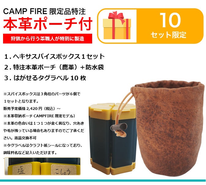 本職の革職人でもあり、自ら罠をしかけ鹿の捕獲から解体・革の生産に至るまでを全て自身で行っているkomorebi氏に制作を依頼したヘキサスパイスボックス専用のオリジナル革ポーチです。ヤマツミアウトドアの焼き印入り。