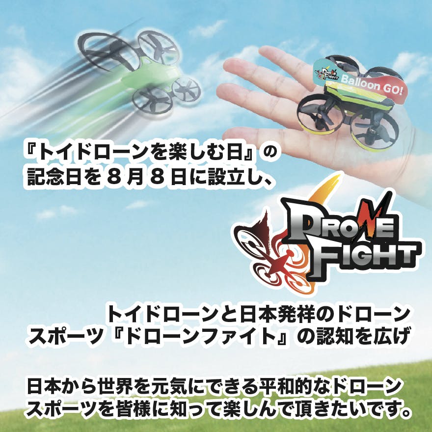 そこで、『トイドローンを楽しむ日』の記念日を8月8日に設立し、トイドローンと日本発祥のドローンスポーツ『ドローンファイト』の認知を広げ、日本から世界を元気にできる平和的なドローンスポーツを皆様に知って楽しんで頂きたいです。そして、資金をサポートしていただきたくクラウドファンディングを立ち上げました。どうそよろしくお願いします。