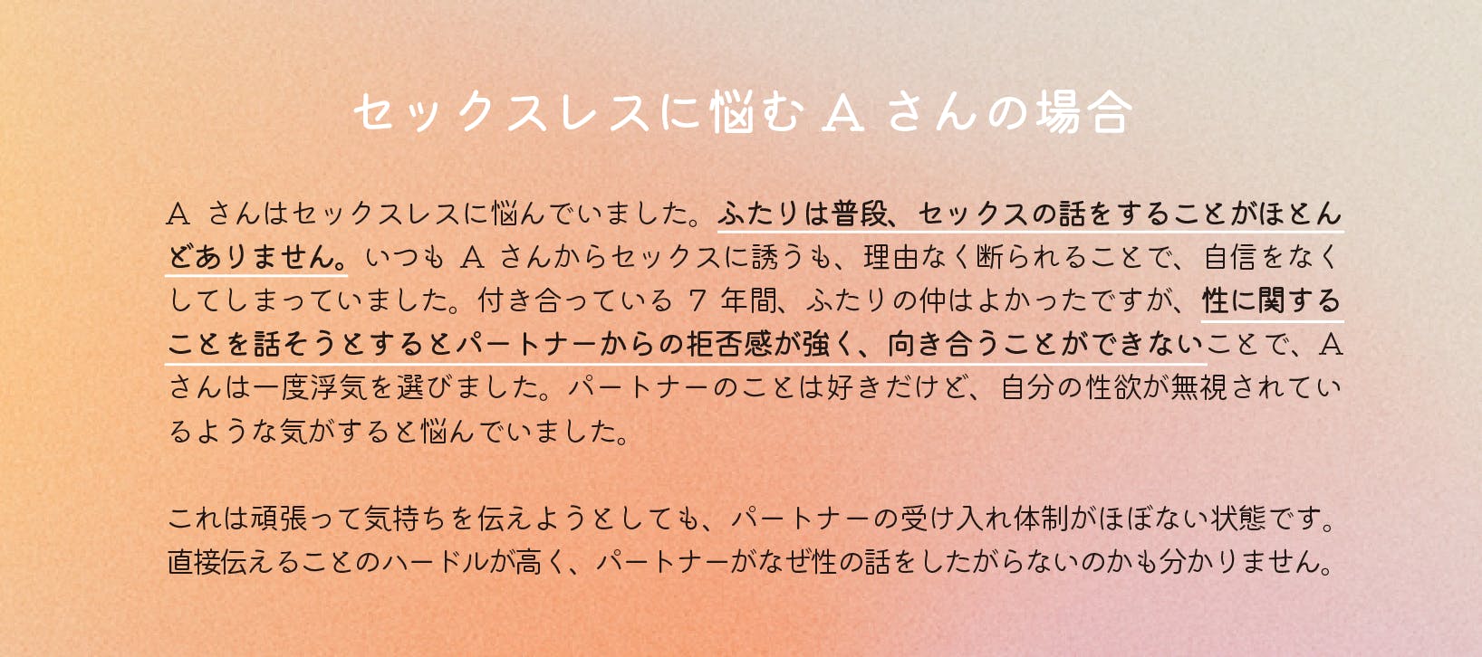 正面切って向き合えないセックスの話には、カウンセリングを受けるなど、第3者が介入して客観視することも一つ重要だと考えます。