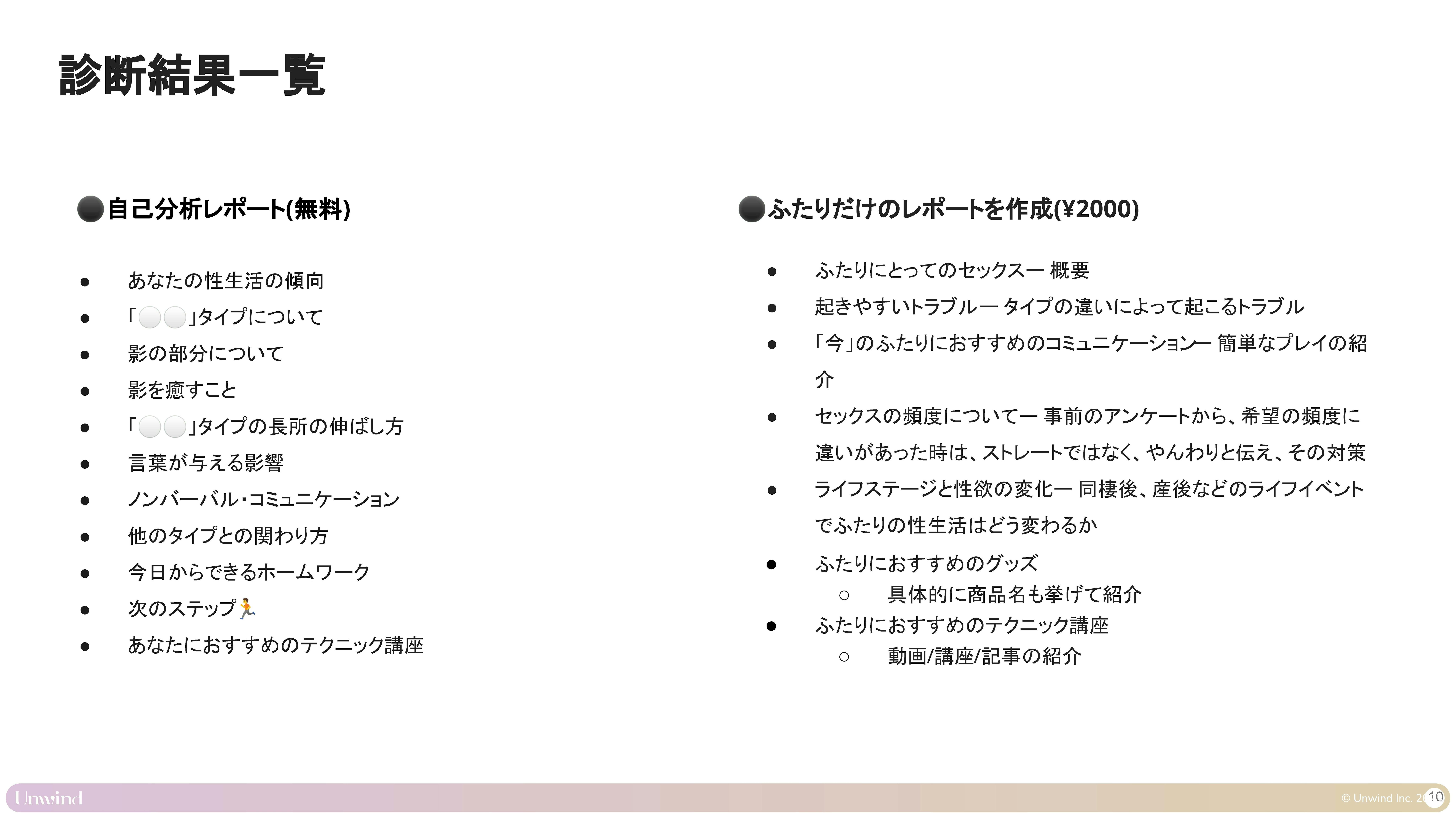 また、カップル向けにお互いの性的嗜好を理解し、より関係を深めるためのコミュニケーションアドバイスやベッド上のテクニックを含めたレポートも提供します。