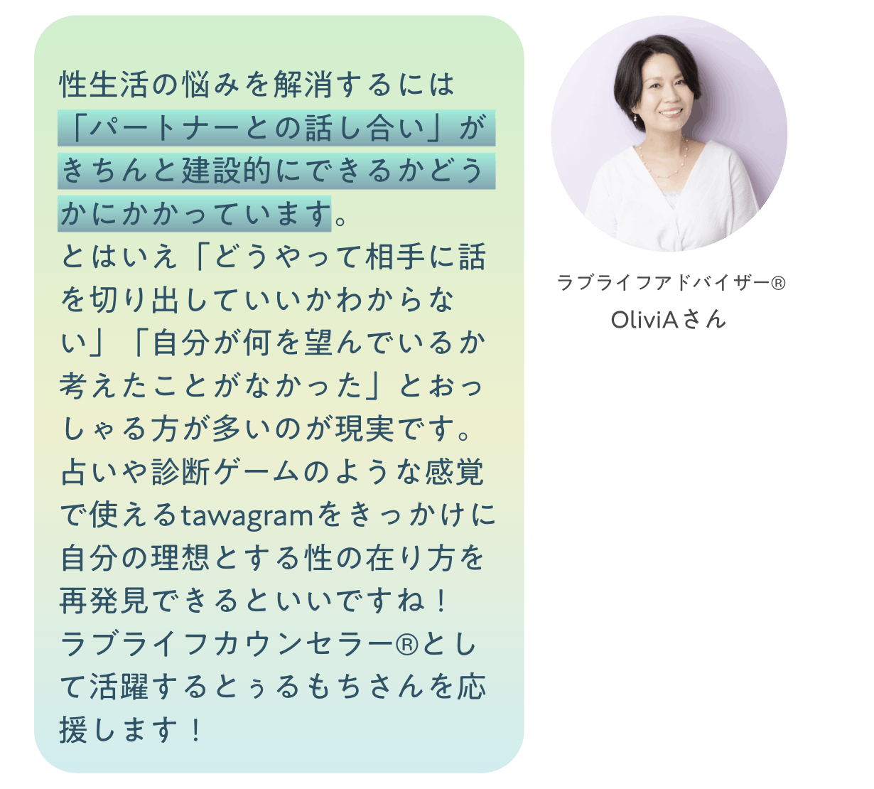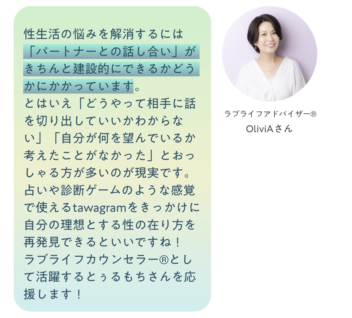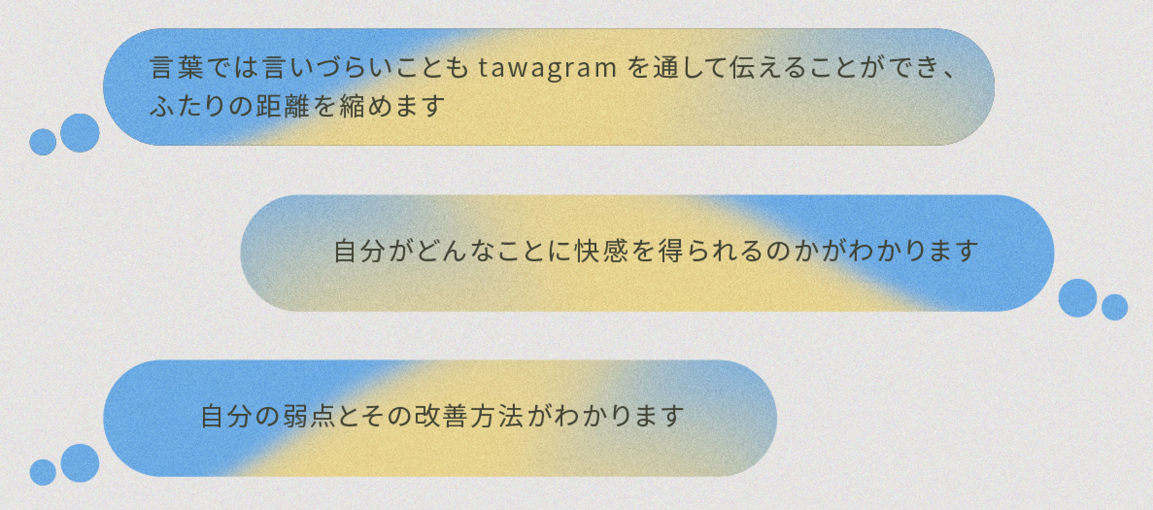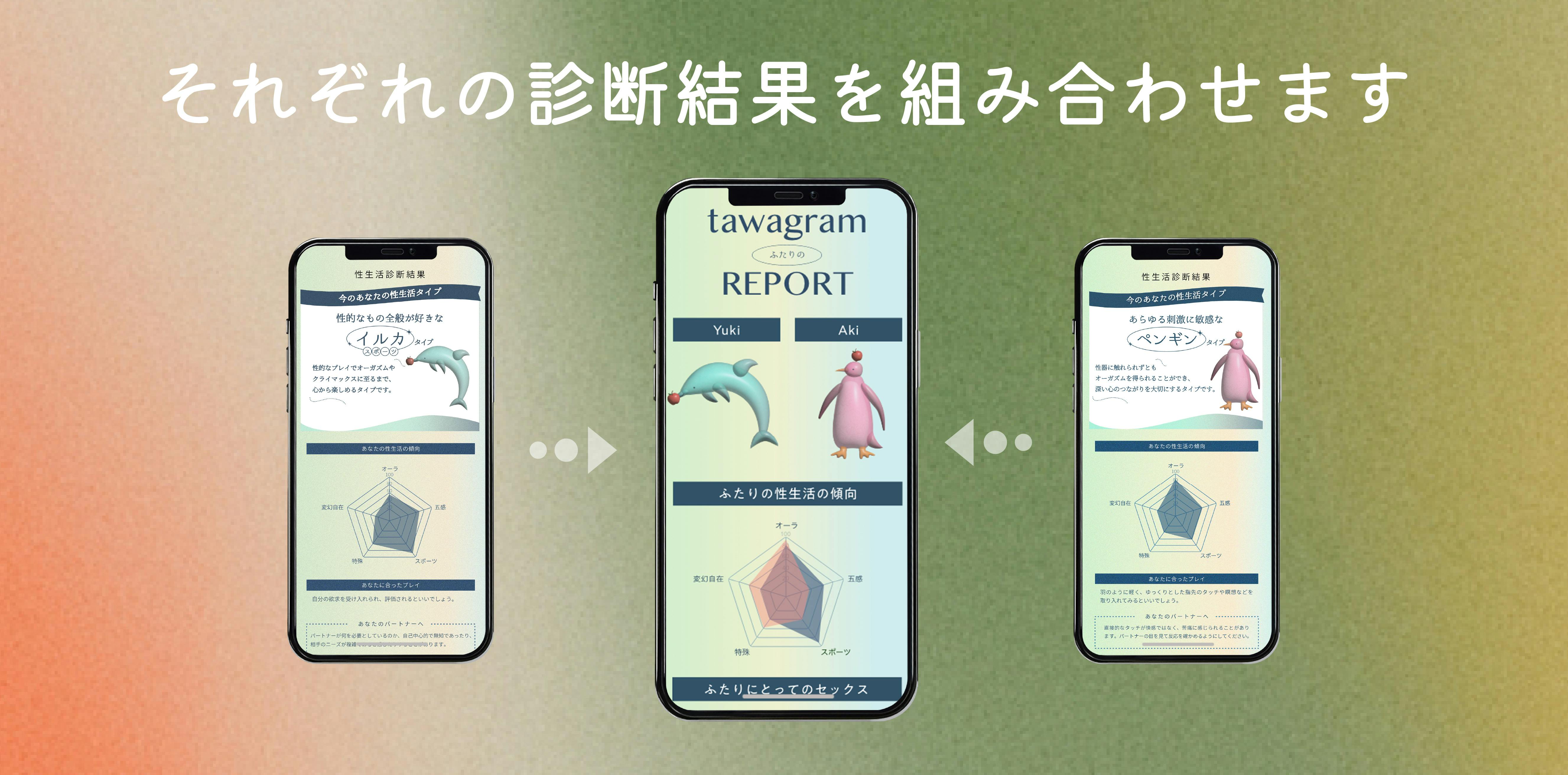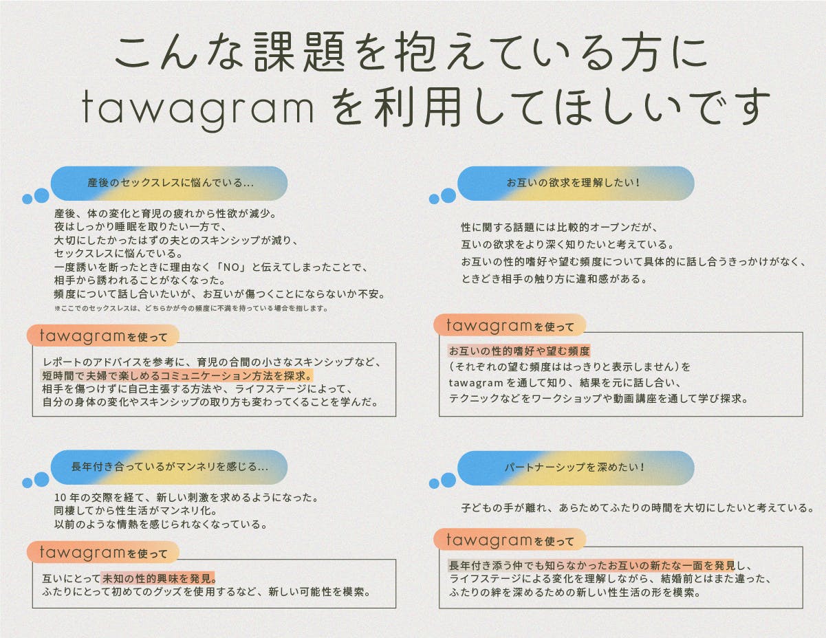 「tawagram」はいくつかの質問に答えることで自分の性生活の傾向を知ることができます。また、カップルで共有することでお互いを傷つけずに性生活の希望を伝え、解決のヒントを提供します。