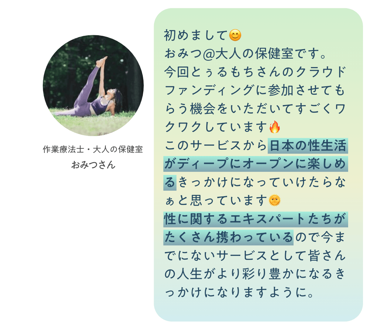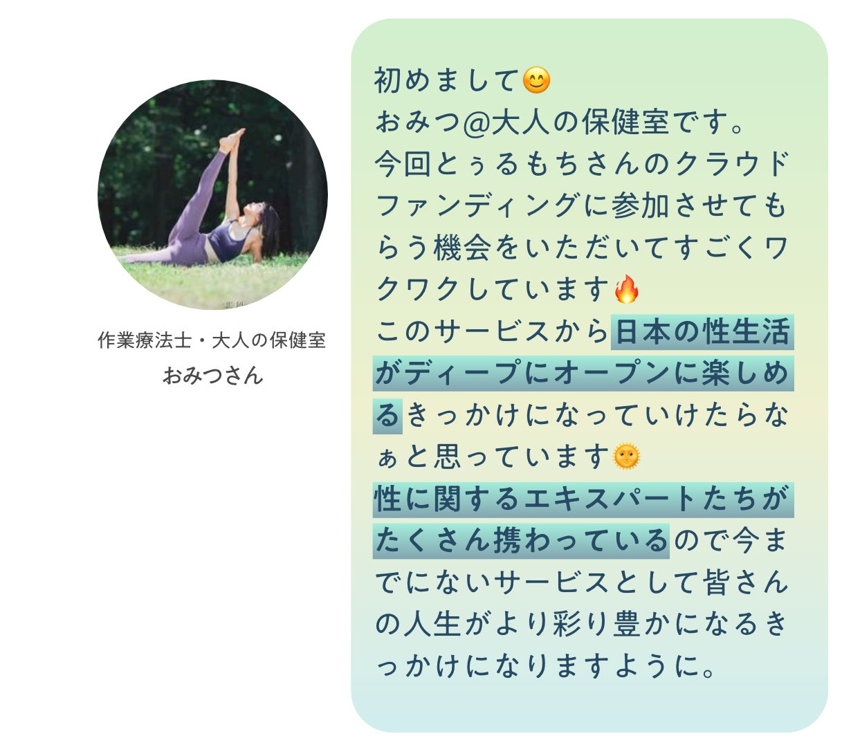 しかし、ヒアリングを続ける中で、性生活に関する問題は確かに存在し、サービスの需要もあることが分かったため、「最初にサービスを届ける人」が誰なのかを改めてメンバーで見直し、改めてクラウドファンディングに挑戦することにしました。