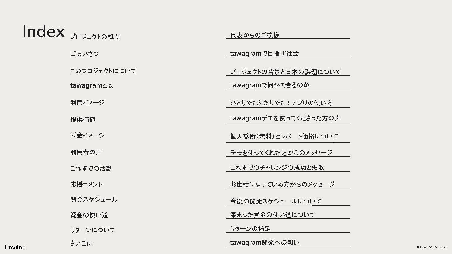 2025/02/06 16:30クラウドファンディングをご支援くださった皆様へいつも応援いただきありがとうございます。ファウンダーのとぅるもちです。昨年夏にtawagramβ版をローンチしてから、ありがたいことに、17万人ものユーザーさんにサービスを使っていただくことができました。それからユーザーインタビューや、産婦人科医の先生方とお話を重ね、これから3つの仮説を検証したいと考えています。・性欲の変化の背景を、体調記録×環境要因(天気や月の満ち欠け)×tawagramの13タイプで見える化できないか・生理周期×ホルモン変動から、あなたの性感度を予測できないか・日々の仕事×食事×心の記録から、性生活の傾向が掴めないかtawagramを熱量高く使ってくださった皆様のうち「過去に長年お付き合いしたパートナーと性の話ができないこともきっかけに別れを選んだ。だからこそ、今のパートナーとは早めに性の話ができるようにしておきたい」という気持ちが強い方が多かったのが印象的でした。性についてオープンに話したい人にとっても、まだ研究が進んでいないこの分野については、自己理解や言語化が難しいのが現状です。 私が感じるのが、自己理解や相手との会話のために努力を惜しまない人だからこそ、どこかで疲れてしまうのではないか…という心配です。 この度tawagramは、そんな頑張りすぎてしまう人たちのためのプラットフォームとして進化を遂げる予定です!もし「今後の動きも気になる!」という方がいらっしゃれば、ぜひLINEの応援オープンチャットにご参加ください。参加方法こちらから、オープンチャットトークルームの「参加」を押すプロフィール(アイコン/ニックネーム)を設定するアンケートなどにご協力をお願いいたします▶︎LINEオープンチャットはこちら◀︎※匿名でご参加いただけます ※オープンチャットの上部に、本プロジェクトと全く関係のないLINEさんによる広告が表示されている場合があります。開催時などにお知らせさせていただきます。引き続きプロジェクトを温かく見守ってくださると幸いです。よろしくお願いいたします。 もっと見る