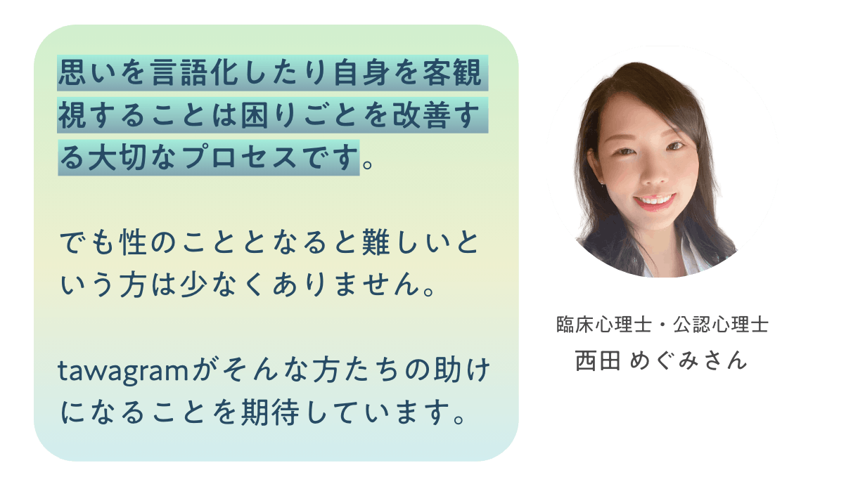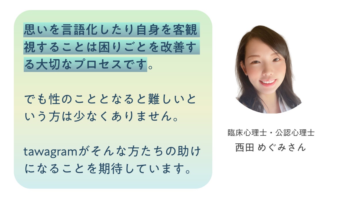 tawagramは、私がやりたいと思っているたくさんあることの中の一つです。性生活分析から、いろいろな選択肢へとつながり、サポートできる環境を作っていきたいです。応援よろしくお願いいたします!