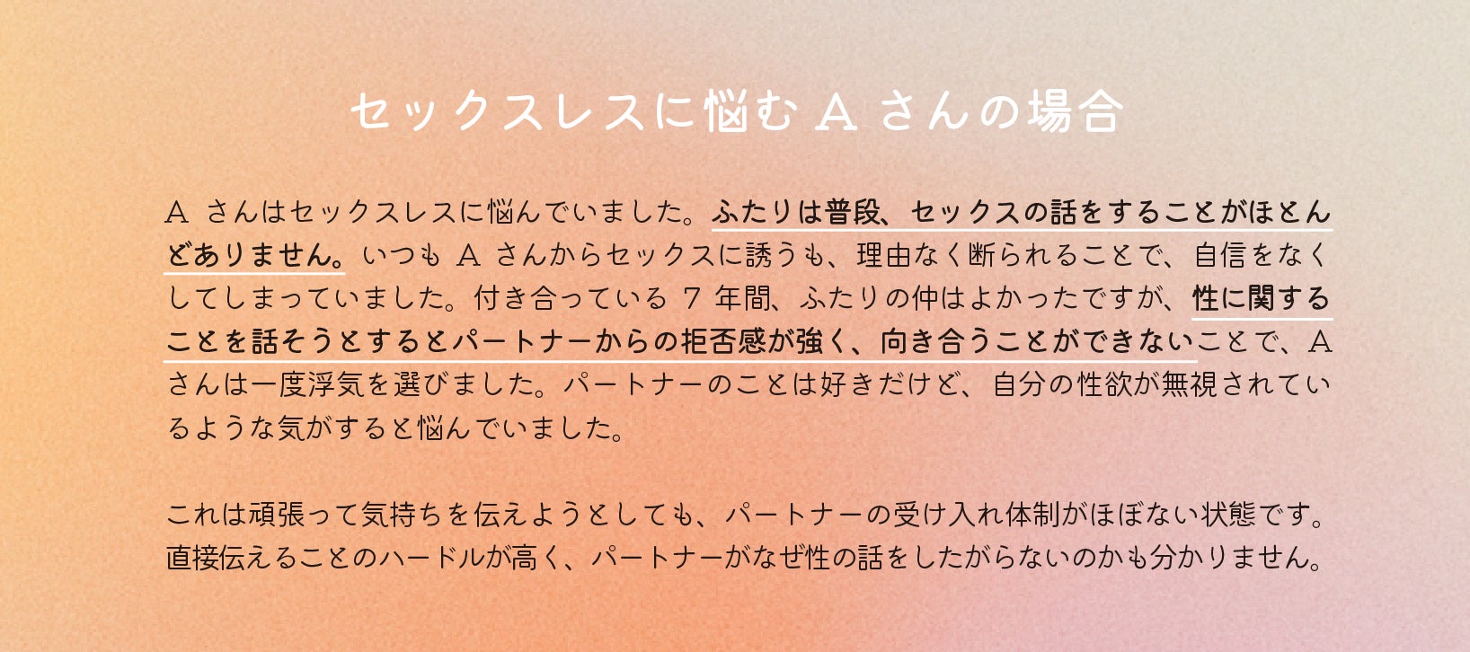 日本では、自分のしたいことを言語化して相手を傷つけずに伝える(アサーティブコミュニケーション)練習を義務教育の間にできていなかったり、性教育も十分に受けられなかったりしたことで、身体を守る環境づくりが十分ではありません。パートナーとのコミュニケーションやセックスをより楽しみたいと思っていても土台がしっかりしていなければ、これらを叶えるのは難しいと感じています。