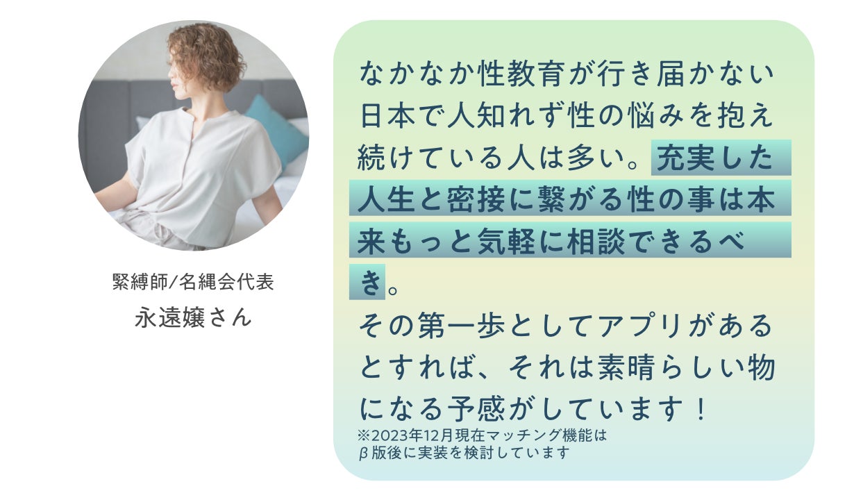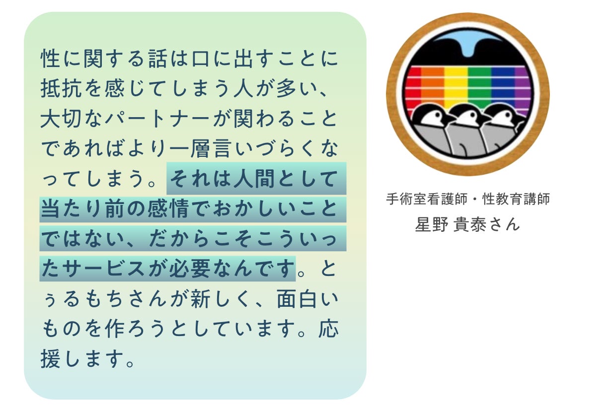 個人の性生活や2人のセックスを探求したい方や、性の悩みを相談したいという方に向けて、ピッタリな専門家をご紹介したり、テクニックを学べる講座や記事、セクシャルウェルネス製品をご提案します。