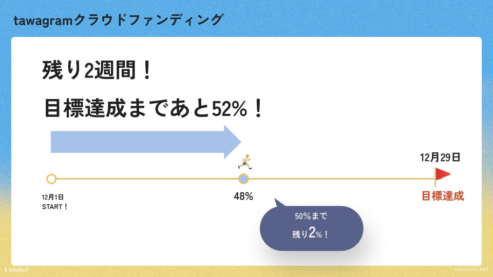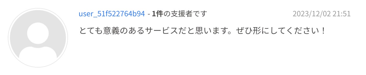 残り2週間、どれだけ多くの人にプロジェクトを知っていただけるかが成功の大きな鍵となります。あらためて、Twitter(旧:X)やInstagramなどSNSなどでのシェアをいただけますと幸いです。