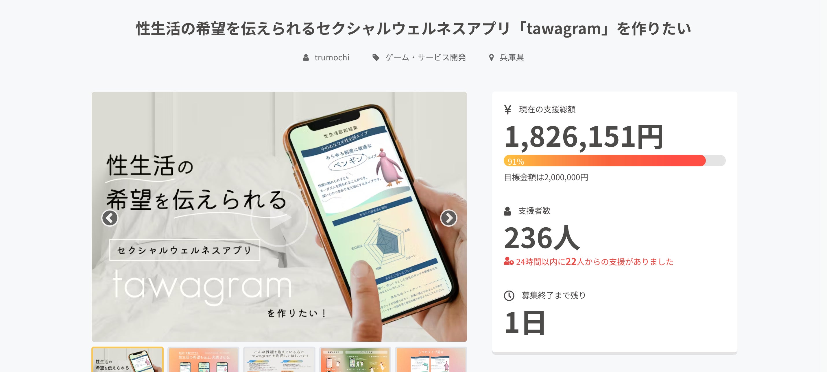 12月1日から開始した、性生活分析tawagramβ版の開発資金をのAll or Nothingのクラウドファンディングですが、残りわずか1日となりました。