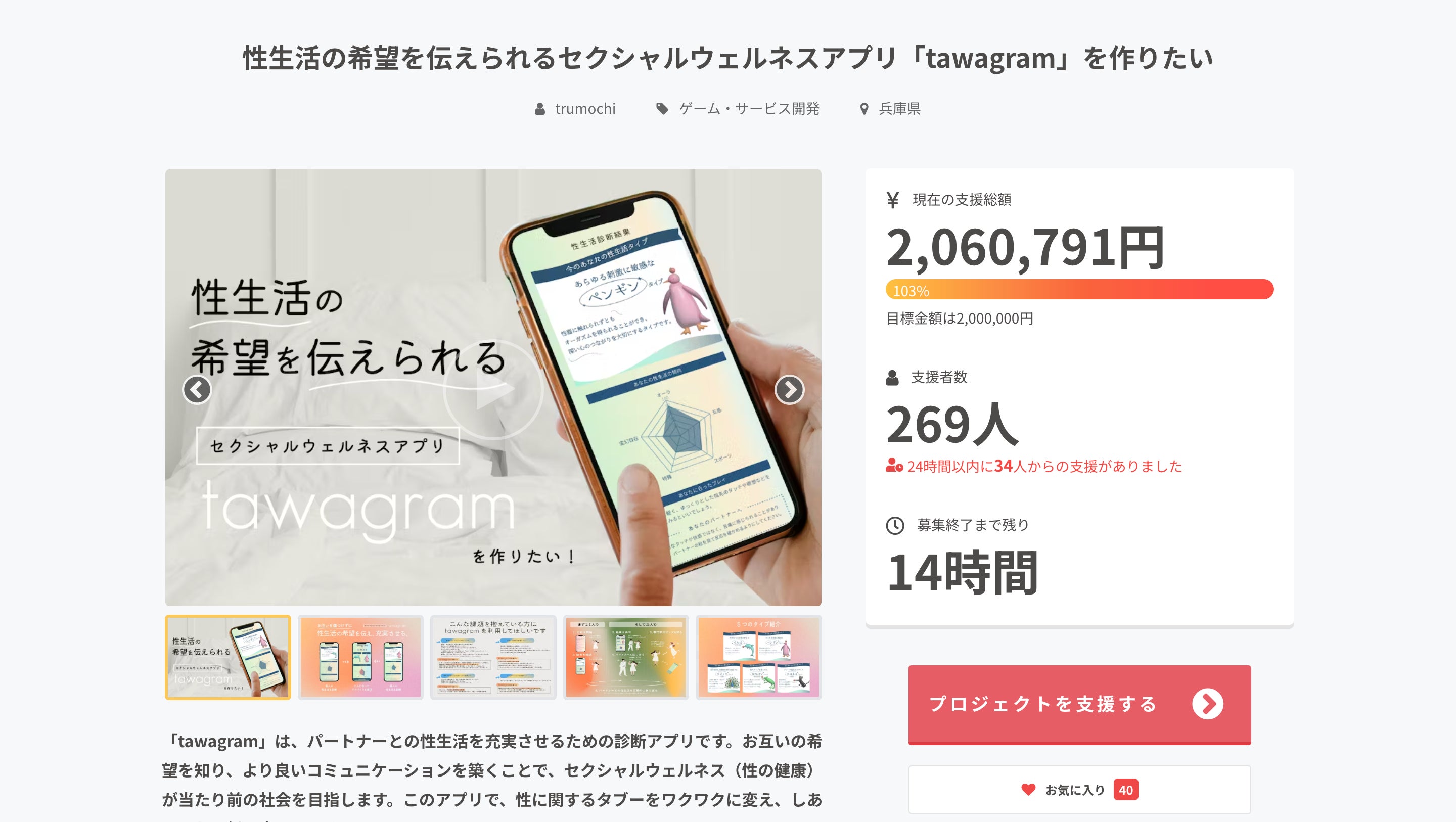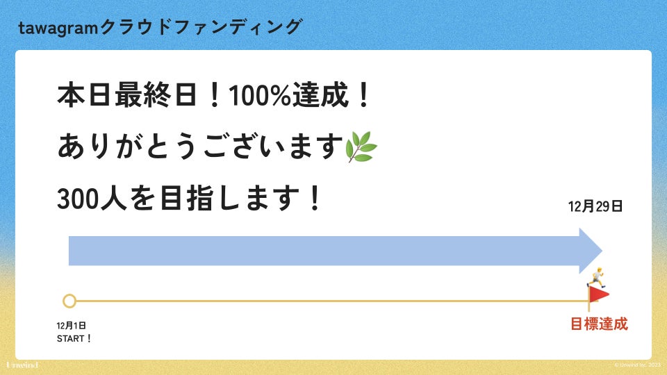 12月1日から開始した、性生活分析tawagramβ版の開発資金をのAll or Nothingのクラウドファンディングですが…昨日目標の100%の達成することができました!