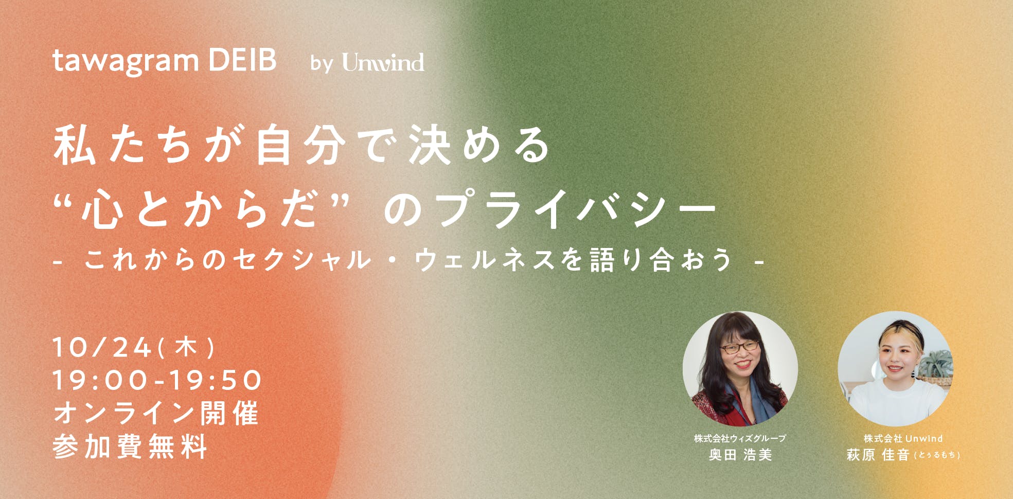 2024/10/24 15:15tawagramファウンダーのとぅるもちです。本日10月24日(木)みんなで「セクシャルウェルネスについて考える会」を開催します!特に、セクシャルウェルネスの定義の一つに含まれる「社会的に健康な状態」とは一体何なのでしょうか?「セクハラがない世界」「みんなが主体的に生きれる世界」…いろんな考え方があると思います。ぜひあなたのご意見も聞かせてください。イベントお申し込みはこちらから!イベントについて私たちがより良く幸せに生きるための「ウェルネス」には、心と体の健康が欠かせません。しかし、その中でも特に「セクシャル・ウェルネス」は、タブー視されがちで、多くの方が悩みを抱えている分野です。そこで、この度セクシャル・ウェルネスの重要性を広め、より多くの人々に関心を寄せていただく機会として、オンライン対談を開催いたします。本対談では、セクシャル・ウェルネスに関する様々なサービスの開発・提供に挑戦中のスタートアップ Unwind の代表である萩原佳音と、FemTechをはじめとする女性起業家とイノベーション支援にご活躍中の奥田浩美さんをお迎えし、テーマであるセクシャル・ウェルネスについて語り合います!対談で取り上げる主なトピックセクシャルウェルネスとは?自分自身のセクシャルウェルネスを理解するためには、どのようなプロセスやステップが必要?セクシャルウェルネスが満たされていると、どのような「良い結果」が期待されるか?」パートナーとのセクシャルウェルネスにおけるコミュニケーションに関する悩み・心配事は?Unwindが提供するセクシャル・ウェルネス診断サービス「tawagram」の紹介本イベントは、特に多くの女性の方々に、セクシャル・ウェルネスの大切さを理解し、自分自身の心と体に向き合うきっかけとしていただける内容となっています。<イベント詳細>- 日時:10月24日 19:00 ~ 19:50- 形式:オンライン(Zoom)- 参加費:無料- 参加申込:Peatix自分の心と体に正面から向き合い、ウェルネスを追求するための一歩を、一緒に踏み出してみませんか?皆様のご参加をお待ちしております!イベントお申し込みはこちらから! もっと見る
