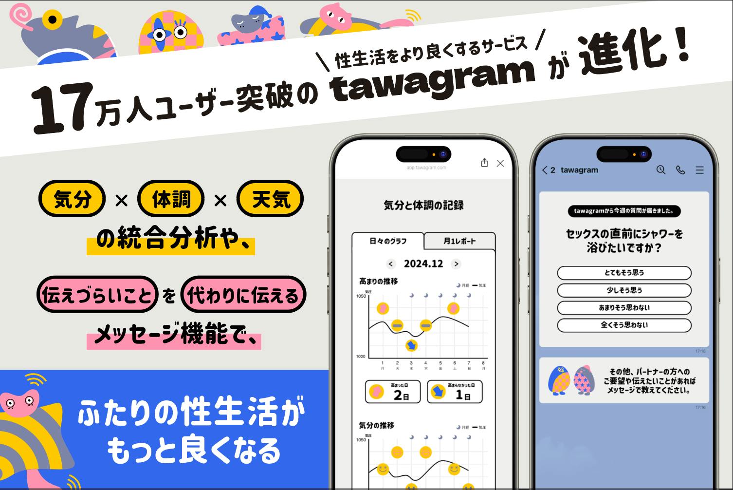 「tawagram」はいくつかの質問に答えることで自分の性生活の傾向を知ることができます。また、カップルで共有することでお互いを傷つけずに性生活の希望を伝え、解決のヒントを提供します。