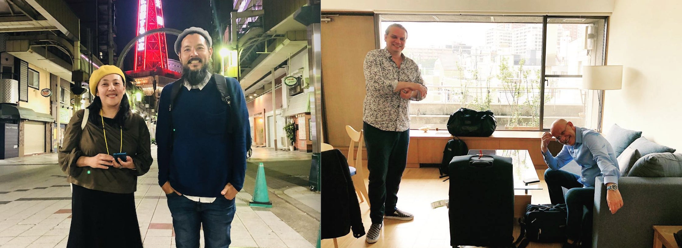 写真(左)2018年5月『ゲッベルスと私』の監督来日キャンペーンで大阪を訪れたサニーフィルムの有田と当時岩波ホールの宣伝部だった矢本理子 写真(右)ウィーンから麻布のアパートメントに到着したクリスティアンとフロリアン