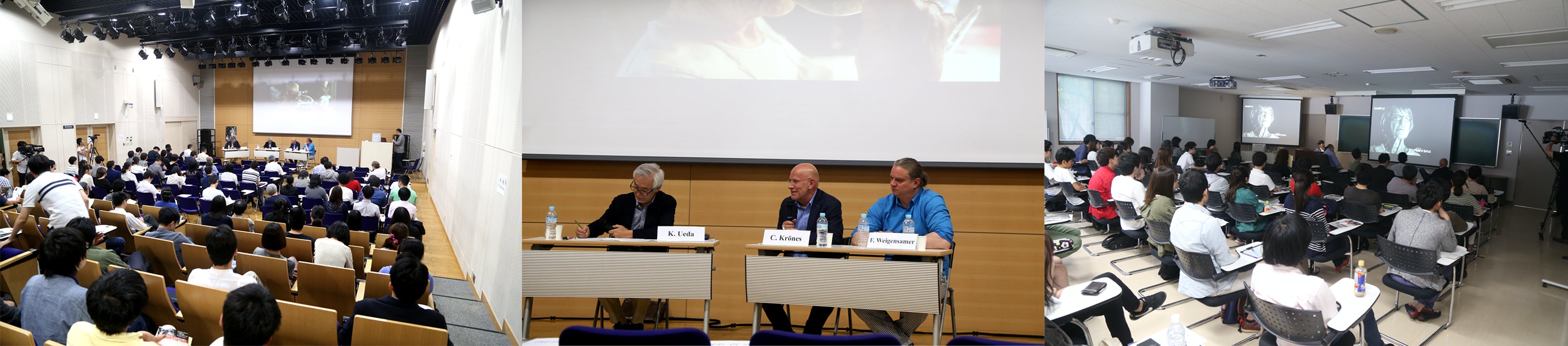 (写真)2018年5月に実施した監督来日企画 左から(2枚:東京大学ドイツ・ヨーロッパ研究センターで先行試写会と監督たちとのQ&Aを実施 右:大阪大学「現代ヨーロッパ政治」で監督たちの特別講義を開講