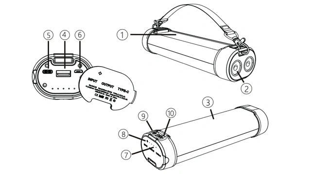 ④USB Aのポート(配電用)、⑤ TYPE-Cのポート(充電用)、⑥ Micro USBのポート(充電用)、