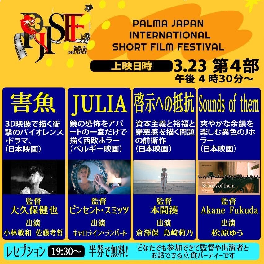2024/03/05 21:20お久しぶりです。『害魚』を企画致しました小林敏和です。なんと、『害魚』が パルマジャパン国際短編映画祭 2024(PJISSF)に入選しまして、劇場で上映されることになりました。ご支援して下さった皆さま、本当にありがとうございます!この映画を劇場でお披露目させて頂けること、大変嬉しく思います。キネカ大森 にて3月23日〈第4部〉16時半~より上映です。本日より映画祭のサイトより、チケットの販売が開始となりました。https://palmaff.jimdofree.com/%E3%83%81%E3%82%B1%E3%83%83%E3%83%88%E8%B3%BC%E5%85%A5/※関係者、スタッフもチケットが必要みたいです。。申し訳ありません。。そして、当日、19時半からはレセプションがあるみたいです!【場所】Luz大森(キネカ大森より徒歩2分)【住所】東京都大田区大森北1-10-14【日時】3月23日㈯ 19時30分~21時 (映画祭第5部終了後)【料金】1500円(映画チケット半券で無料)注意:定員を超えた場合には入場をお断りさせていただく場合もございます。何卒、ご了承くださいませ。とのことです。。会場でお会いできることを楽しみにしております‼︎ もっと見る