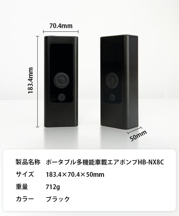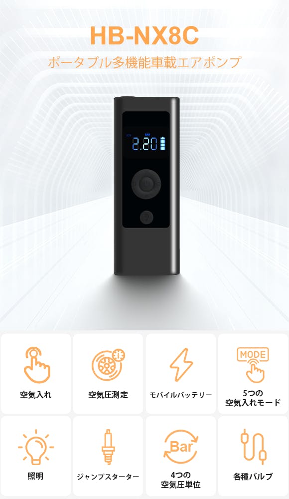 HB-NX8Cは、ジャンプスターター、照明、モバイルバッテリー、空気圧測定、空気入れの5つの機能を持つ便利な車載エアポンプです。多機能でポータブル、使いやすさを追求した設計で、様々なシーンで活躍すること間違いありません。