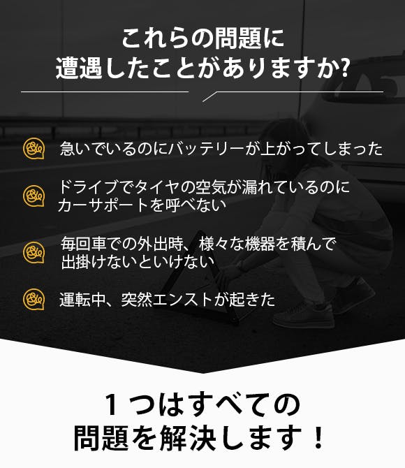 自動車は天候などの影響で、エンスト、バッテリー上がり、タイヤの空気漏れなどの問題が起こりがちです。これらの予防や解決のために、様々な機器を準備しておかなくてはなりません。