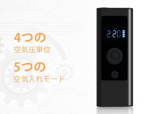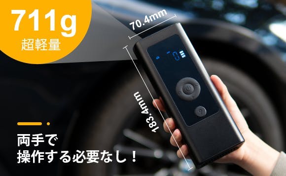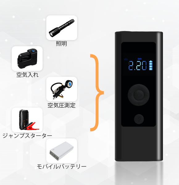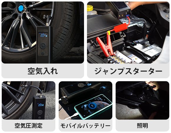 空気圧測定、空気入れ、ジャンプスターター、照明、モバイルバッテリーがひとつになった5in1の多機能設計で、日常生活から非常時まで活躍する頼もしい1台です。
