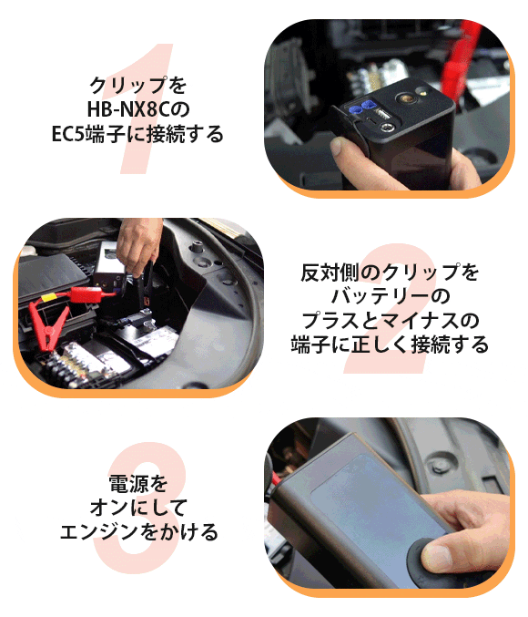 ジャンプスターターの取り扱いに慣れない方は、そんな心配がありますよね。HB-NX8Cなら、簡単な3つのステップで接続できます。