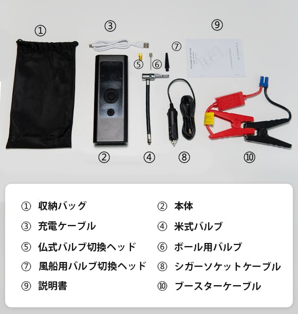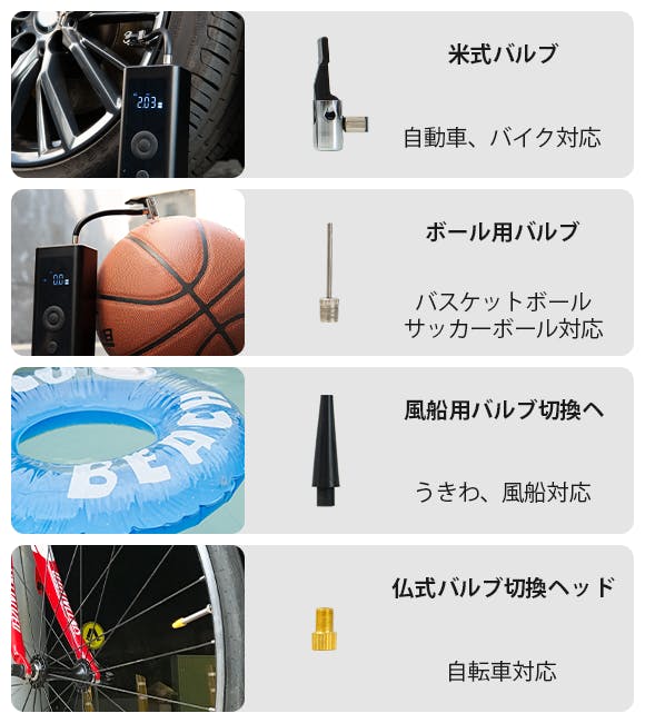 さらに、バルブは米式、仏式、ボール用、風船用の4つのタイプが付属しています。日常生活で使う様々な物に空気を入れることができますので、キャンプなどのアウトドアレジャーでも1台あると大変便利です。