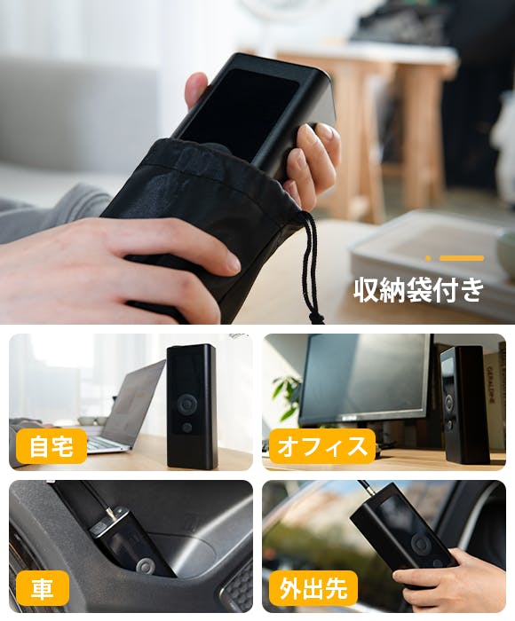 付属の収納バッグに本体とケーブル、バルブをまとめておけば、ご自宅や愛車、オフィスなどに場所を取らずに置けて、必要な時にさっと取り出して使うことができます。