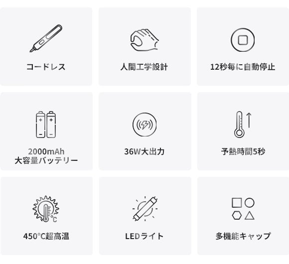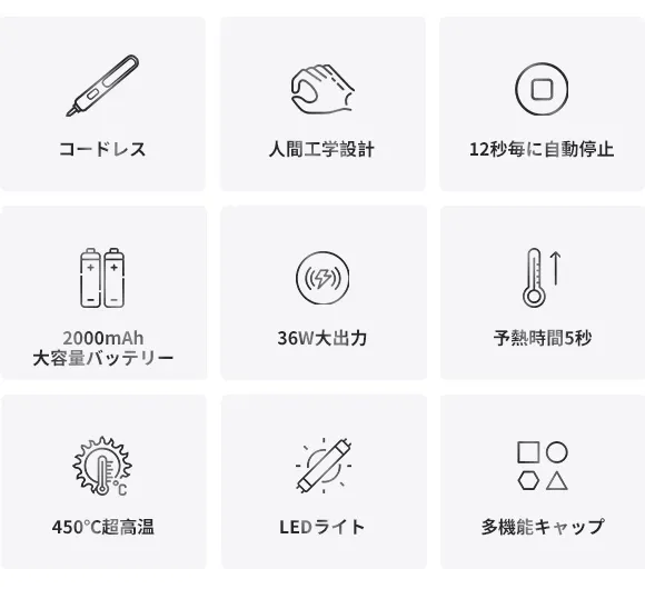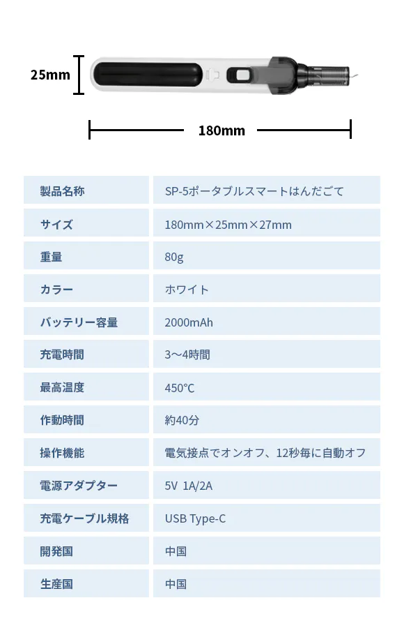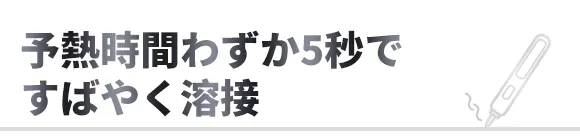 SP-5は 2000 mAhリチウムバッテリー搭載、ポータブルなコードレス設計です。予熱時間わずか5秒で400℃以上に加熱でき、待ち時間なく溶接を始められます。また、ムダのない握りやすいデザインで、より正確な作業が可能です。