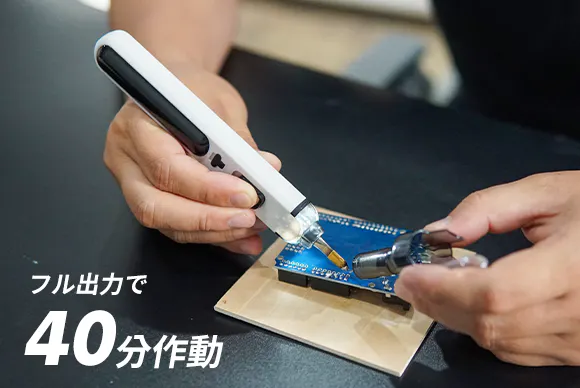 SP-5は2000mAhの大容量リチウムイオンバッテリーを内蔵したコードレス設計です。持ち運びも作業もしやすく、フル出力で40分作動でき、いつでもどこでも手軽に溶接を行うことができます。