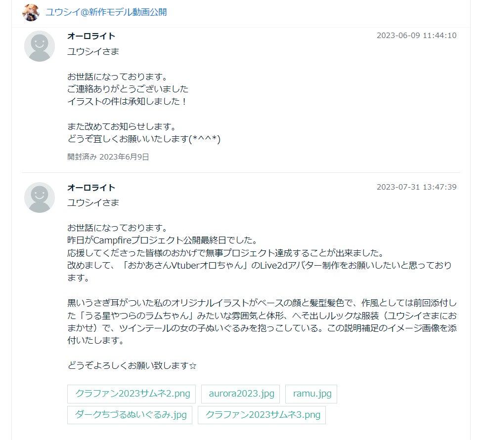 この度は、私のプロジェクトに応援ご支援をいただき誠にありがとうございました。おかげさまで本プロジェクトを達成することが出来ました。今日はLive2dアバタークリエイターのユウシイさまへ、プロジェクト達成のご報告とアバター制作の正式依頼メッセージを送りました。まだ現実味がないけれど、シャボン玉で遊ぶ準備中の子どもみたいに楽しみな気持ちが心のなかで小さく踊っています。わくわく今後も経過報告いたしますね♪