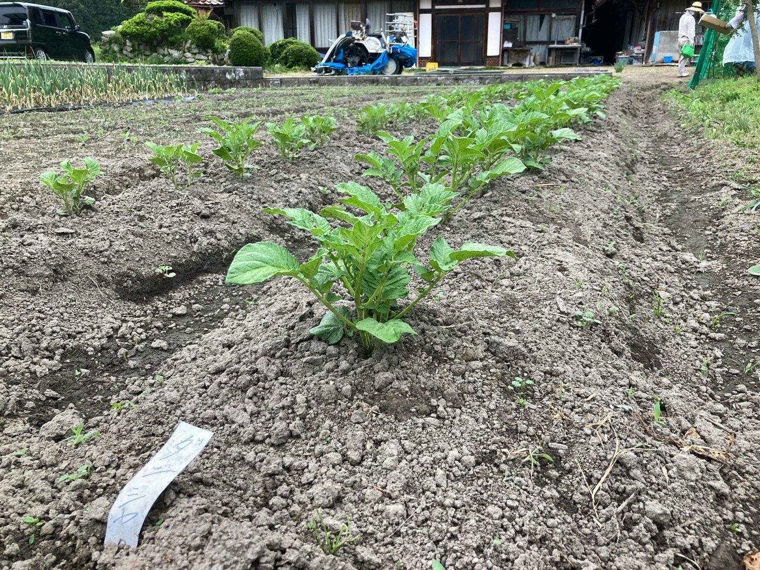 ジャガイモ、ニンニク、スナップエンドウ、タマネギ、ゴーヤ、枝豆、ナス、キュウリ、シシトウ、サトイモです。