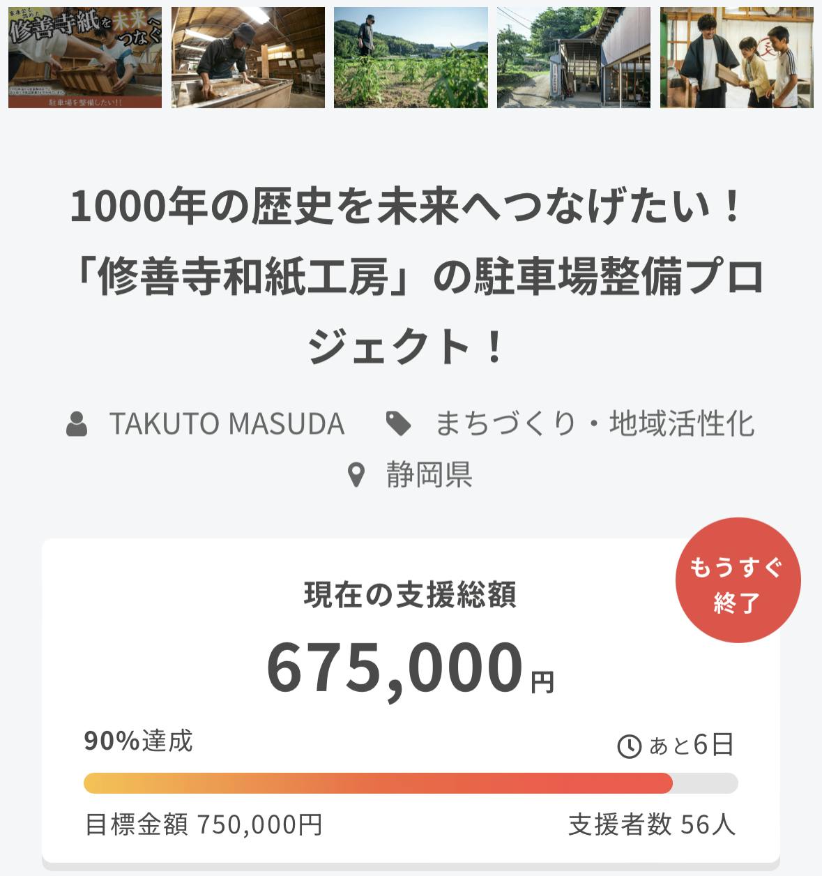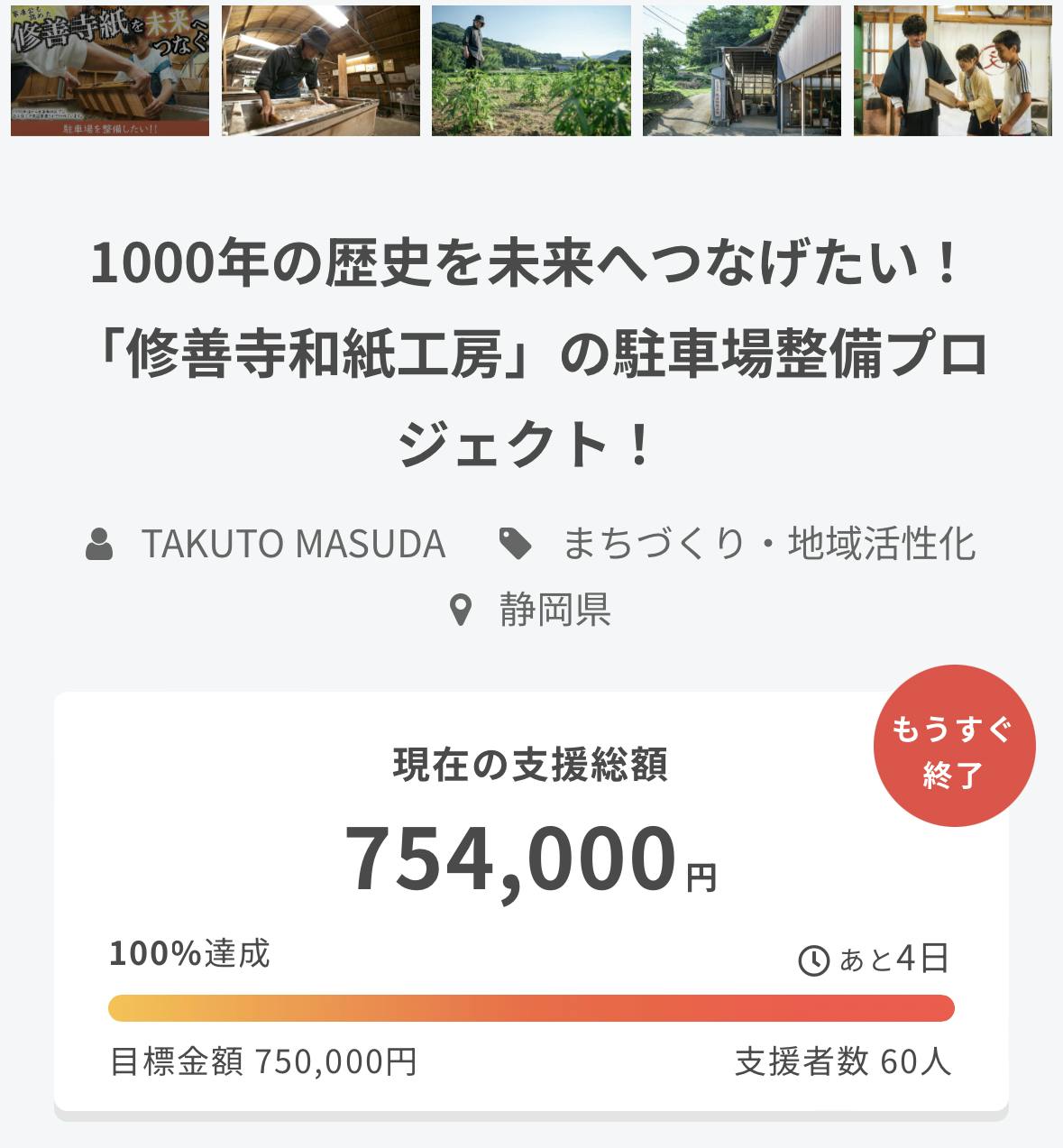 2023/08/27 10:36こんにちは!8/1から開始しておりました我々のクラウドファンディング、4日を残しまして、目標金額75万円を達成いたしました!皆様のおかげです!ありがとうございました!ご支援いただいた金額は駐車場整備費用として大切に使わせていただきます。ありがとうございます。リターンの発送も来月から順次やってまいりますので、楽しみにお待ちください!さて、残り4日とほとんど残された時間はないのですが、次なる目標を立てました。ネクストゴール100万円に挑戦!みなさん。あと25万円。もう少しだけご協力いただけないでしょうか。というのも実は、駐車場整備にかかる費用は合計約100万円かかるという見積りが出ています。今回の75万円という最初の目標金額は、初めてのクラウドファンディングということもあって我々の持ち出しも加味した、かなり控えめな金額設定になっていました。もう少し追加で支援が集まれば、そのお金をさらに駐車場整備にまわすことができます。※もしオーバーしてご支援いただいた場合は、駐車場以外の工房の電気設備の整備など、全て修善寺紙を繋ぐための費用に充てさせていただきます。あと4日。あと25万円。あともう少しだけご協力をお願いしたいです。情報の拡散(以下がページのURLです)や、また2度目のご支援も大歓迎でございます。https://camp-fire.jp/projects/view/674868?utm_campaign=cp_po_share_c_msg_mypage_projects_show皆様のご支援が修善寺紙の文化継承につながります。皆様のお力をもう少しだけ貸してください。よろしくお願いします! もっと見る