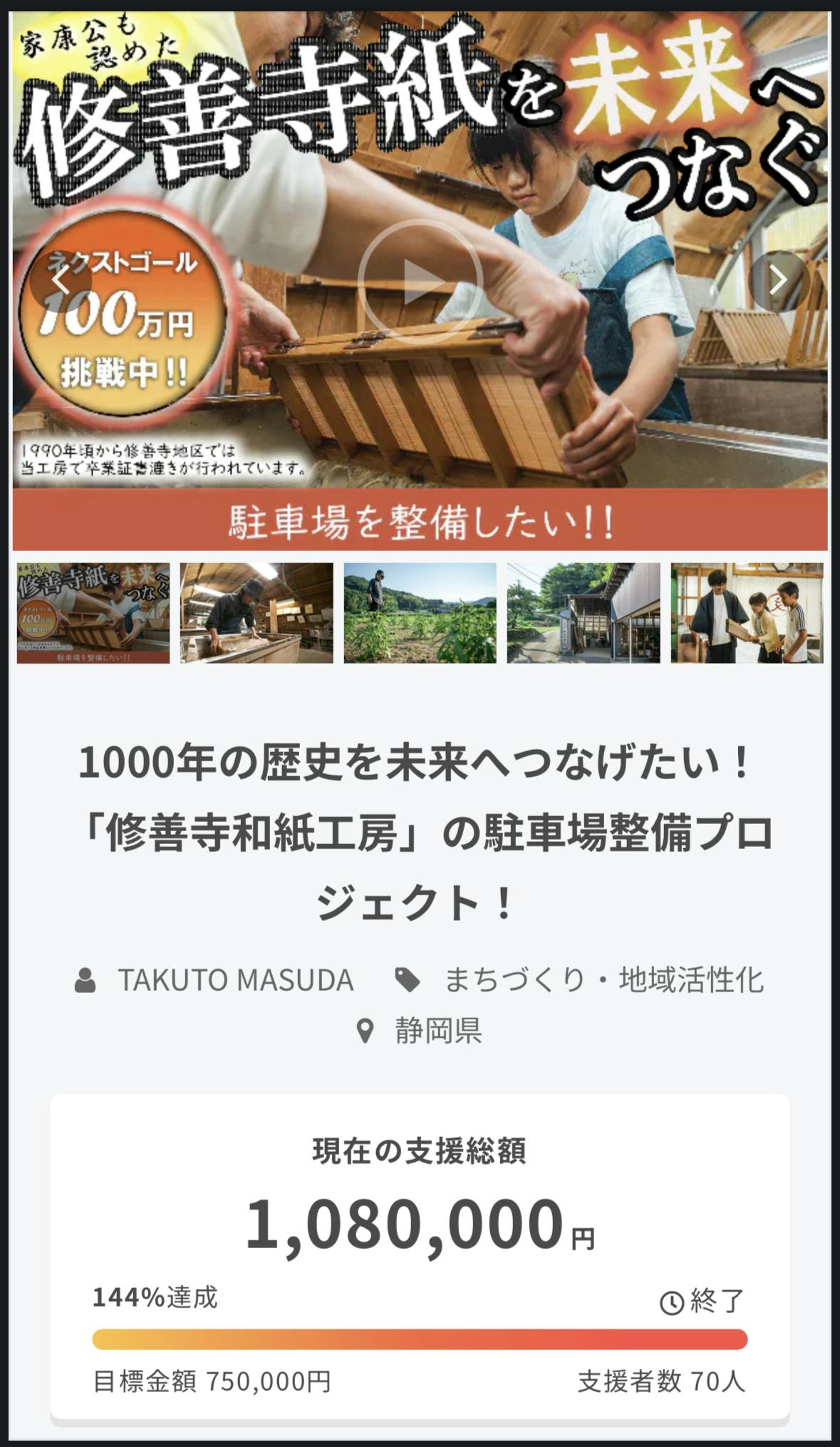 2023/09/01 08:50本日は感謝感謝の投稿です。我々紙谷和紙工房では、8月の1ヶ月間、工房の駐車場整備費用として75万円を集めるためのクラウドファンディングに挑戦しておりました。昨日全日程を終えまして、気になる結果はと言いますと、、、支援者数70名!達成率144%!!支援金額108万円!!!目標金額を大きく超え、セカンドゴールに設定した100万円も超え、108万円という、とても多くの支援を集めることができました。本当にみなさま、ありがとうございました!ご支援いただいた方はもちろんですが、情報を拡散していただいた方も含め、ほんとに皆様の力あってこその大成功だと思っています。感謝しかありません!!今回はじめてのクラウドファンディング挑戦だったわけですが、想像以上にたくさんのご支援をいただくことができました。これは、“修善寺紙”というものが、皆様から大きく期待されていることの証だと思っています。改めてですが、身の引き締まる思いでいます。今回集まったご支援はお伝えしていた通り、駐車場整備費用に充てさせていただきます。駐車場整備の進捗は随時共有してまいります。完成を楽しみにお待ちいただければと思います。また、ご支援いただいた方には、リターン品の送付も順次行ってまいります。こちらも楽しみにお待ちいただければと思います。皆様の力で、修善寺紙の歴史が一歩前へ動きました。これに満足することなく、これからさらに修善寺紙、我々の工房が前へ進めるよう、積極的にチャレンジしていきます。期待に応えられるよう、全力で頑張ります!今後とも応援、よろしくお願いします。 もっと見る