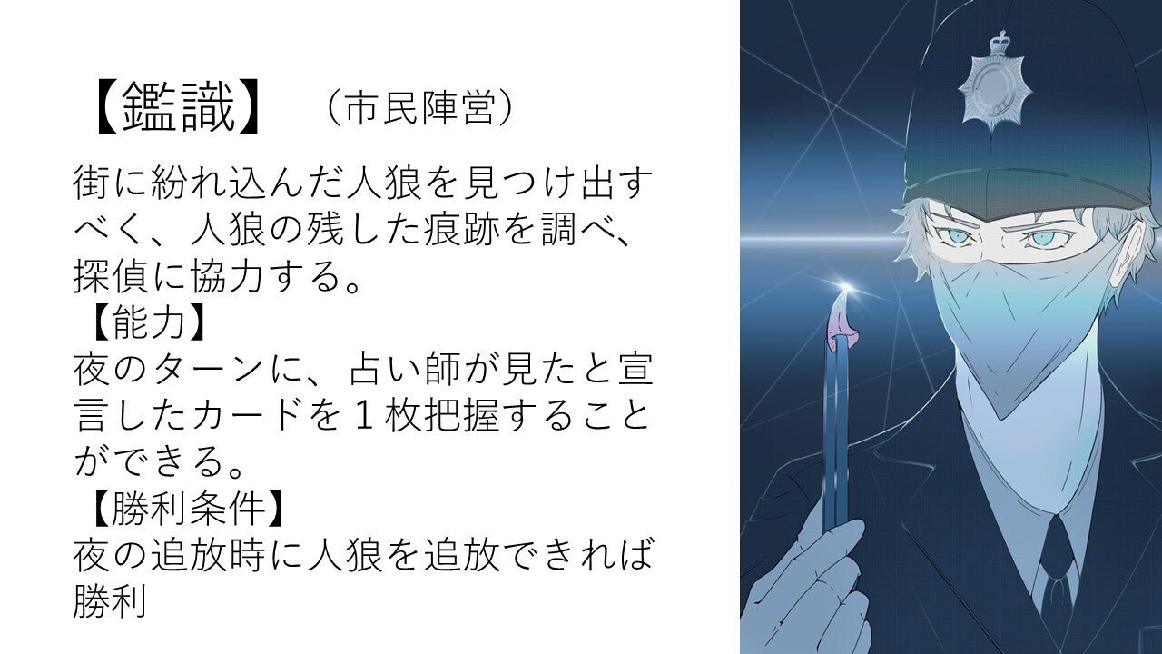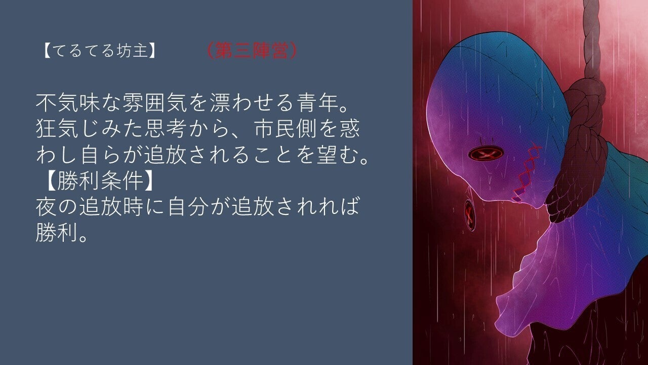 ゲームのカギとなる役職の紹介です。個性あふれるキャラクター達のデザインをご覧ください。