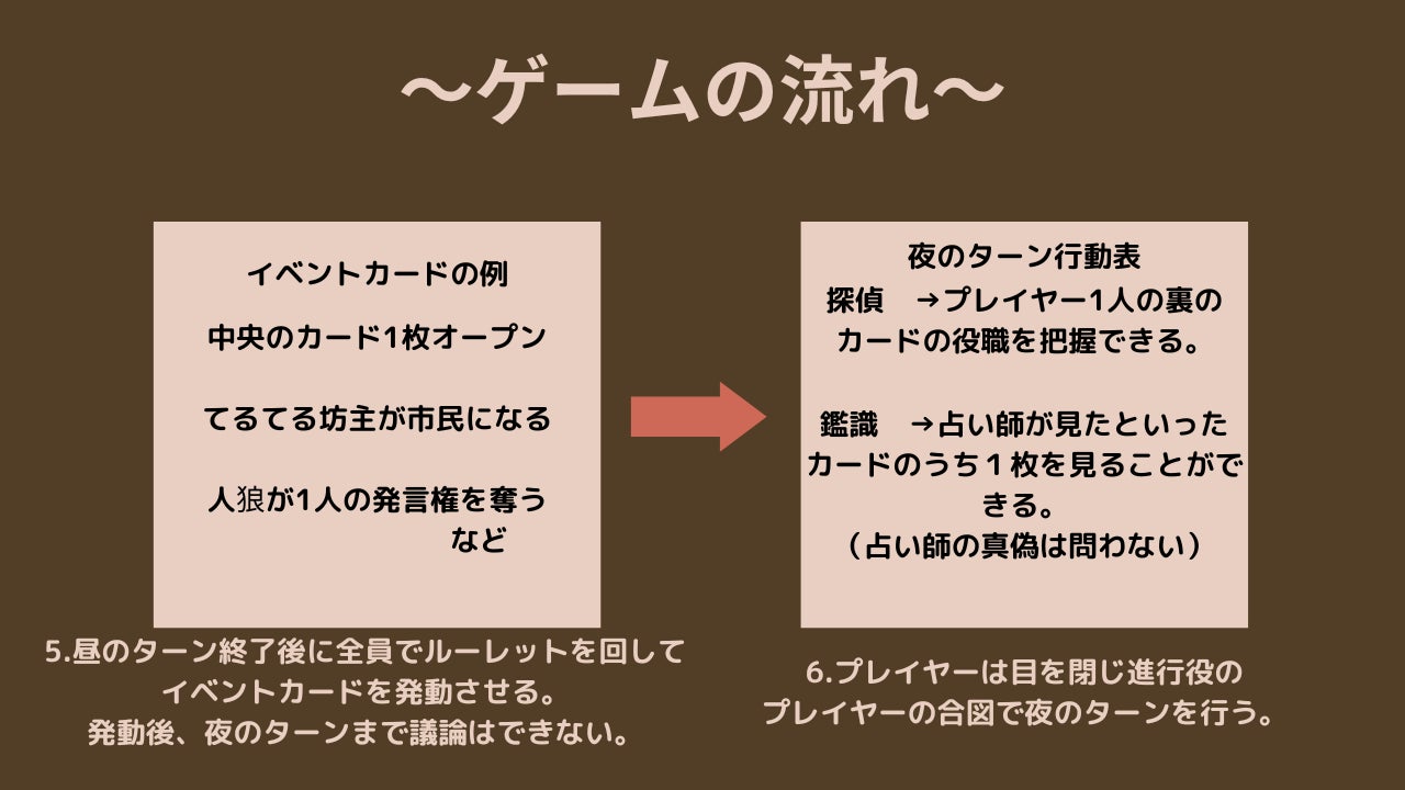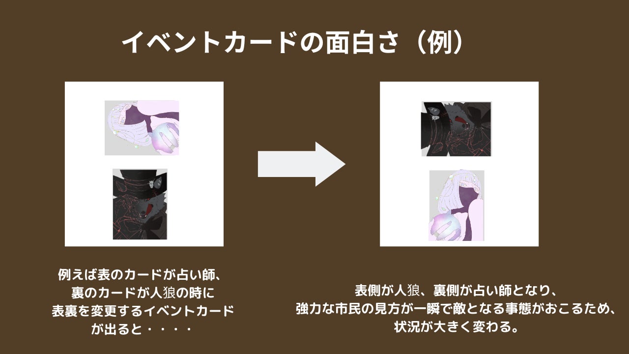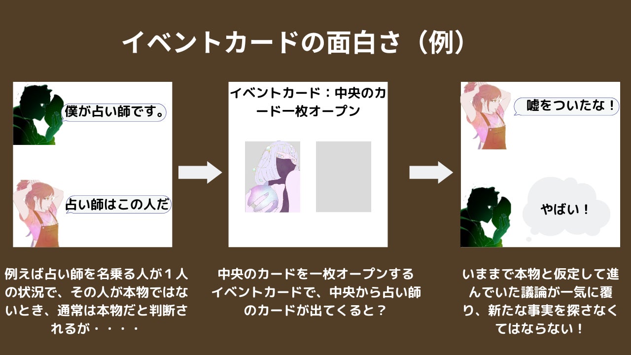 本作の目玉は何といってもこのイベントカードになります。昼のターンでの話し合いで各々の主張する役職、占い師の結果が分かり、鑑識、探偵を使った夜のターンでさらに手がかりを得ようとする前にイベントカードを発動します。イベントカードには中央のカードが1枚オープンされ市民チームに有利になる効果や、人狼が指名した人の発言権を奪う(最後の投票での投票権は持つ)人狼有利な効果、てるてる坊主が強制的に市民に生まれ変わる効果など、議論をさらに混乱、白熱させるカードが集まっています。各々の推理力、瞬時な機転が求められます。