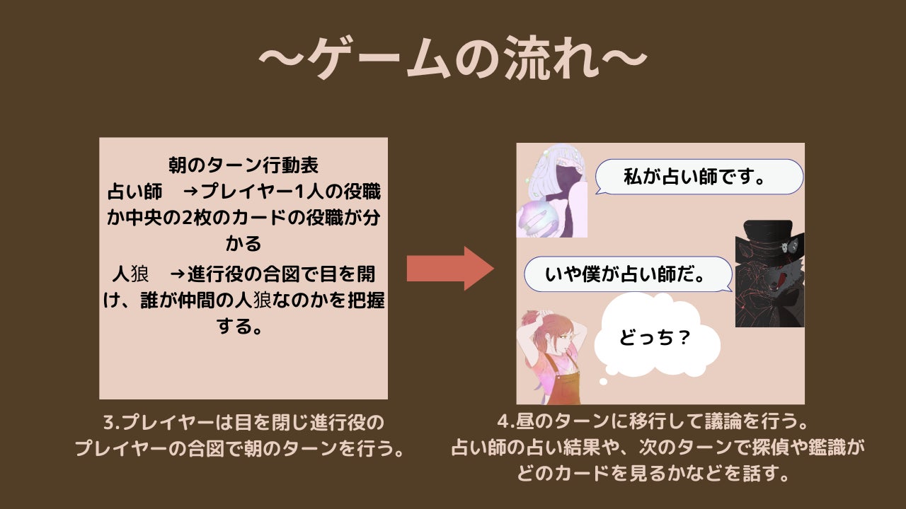 人狼ゲームをプレイしたことがある人なら感じると思いますが人狼ゲームは占い師の力が強く、占い師中心に話が進みます。議論も基本的に占い師の占い結果から流れが始まります。しかし「人狼タクティクス」では1人1人の表と裏のカードが議論の手がかりであり、占い師の結果と同様に1人1人の主張も重要視されます。後半にいくにつれて主張の食い違いを見つけ出すためにも占い師以外の立ち回りも大切なのです。