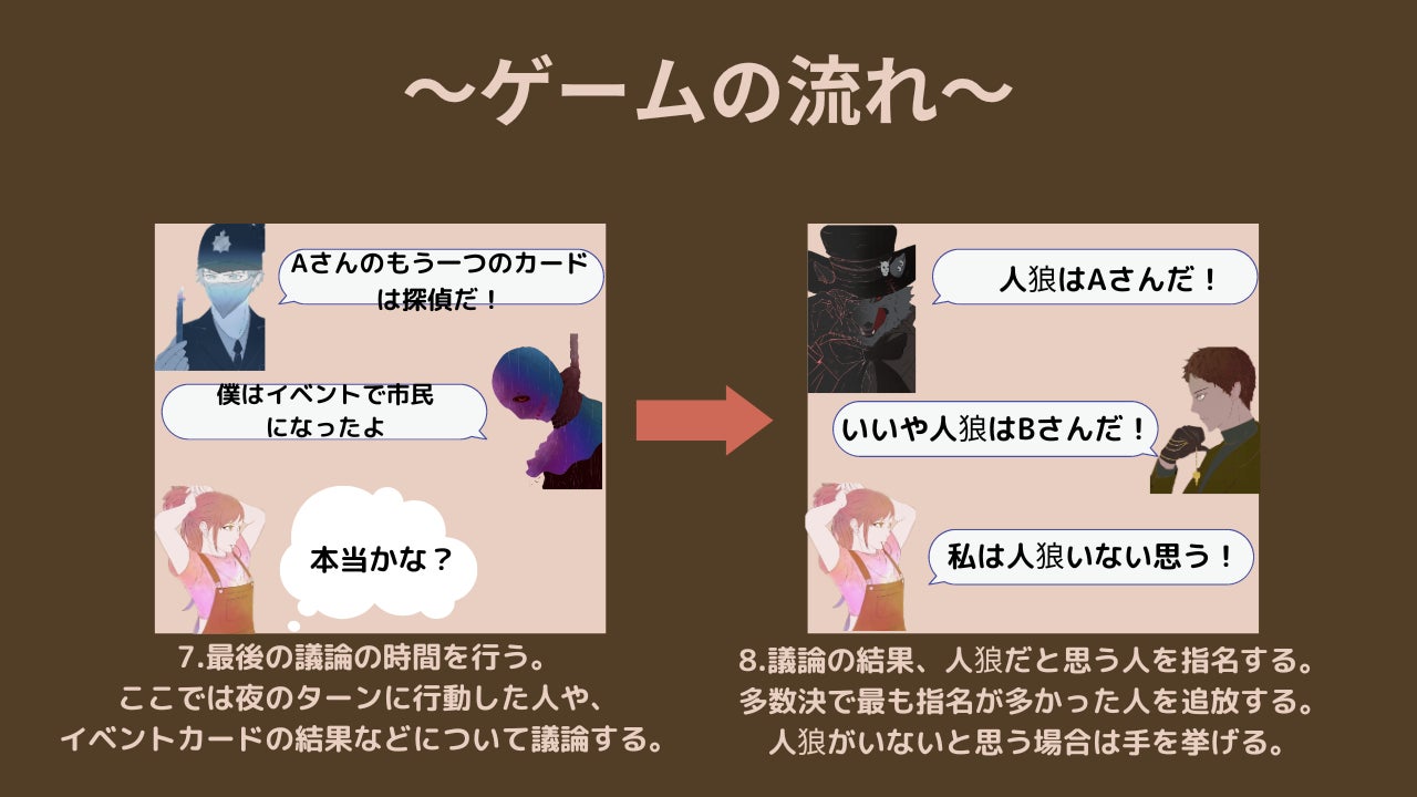 もともと人狼ゲームをはじめとするカードゲーム、ボードゲームが好きで多くの種類を買っては友達とやっていました。その中で自分達の中でルールを改良し更に楽しめるルールを作り始めたのがきっかけです。そこから自分たちの経験を活かして、頭を使うカードゲームを作りたいと思い作成を始めました。今回のカードゲームでは数多くのゲームのいいとこどりをした、カードゲームが好きな人、人狼ゲーム経験者がより楽しめるような作品にしました。