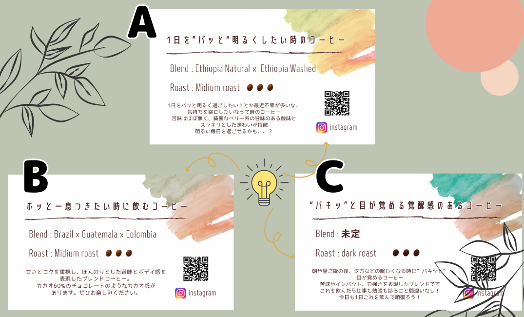 ※メールやZOOMなど(支援者のご希望に添う)で「気分やお好み」などを聞かせていただき、ご希望のオリジナルブレンドを作らせていただきます。