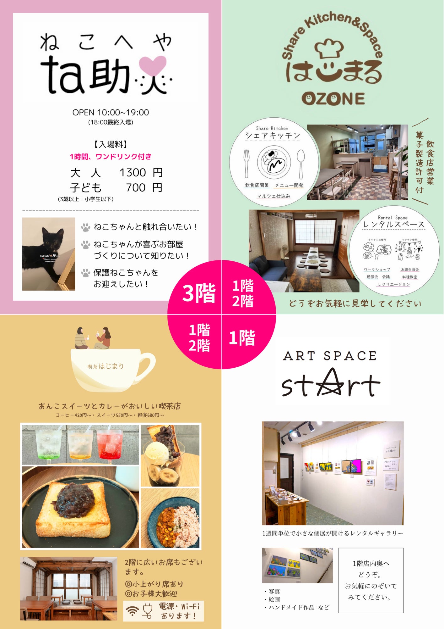 2023/11/29 22:06みなさまお久しぶりです!大曽根商店街 つどいタウンです!8月31日に喫茶はじまりがオープンし、アートスペースstArt(スタート)、シェアキッチン&スペースはじまると、順に通常営業をスタートしておりましたが、ついに、3階のねこへやta助(たすけ)も本格営業が始まりました!!!先月から、地元のお客様には少しずつご入場いただいておりましたが、なかなか新しいお家に慣れない猫ちゃんもいたため、ゆっくりペースでの営業とさせていただいておりました。ようやく、猫ちゃんもスタッフもねこへやta助での生活に慣れ、元気いっぱいに遊べるようになりましたので、改めて「つどいタウン全館グランドオープン」という気持ちでお知らせです!年明けにはつどいタウン全体でのイベントも計画中ですので、皆様ぜひ公式SNS等をチェックしていただけますと幸いです。つどいタウン公式Instagramhttps://www.instagram.com/tsudoitown_ozone/ねこへやta助のInstagram https://www.instagram.com/tasuke_tsudoitown/喫茶はじまりのInstagram https://www.instagram.com/kissa_hajimari/シェアキッチン&スペースはじまるのInstagram https://www.instagram.com/hajimaru_tsudoitaun/アートスペース スタートのInstagram https://www.instagram.com/artspace_start/ もっと見る