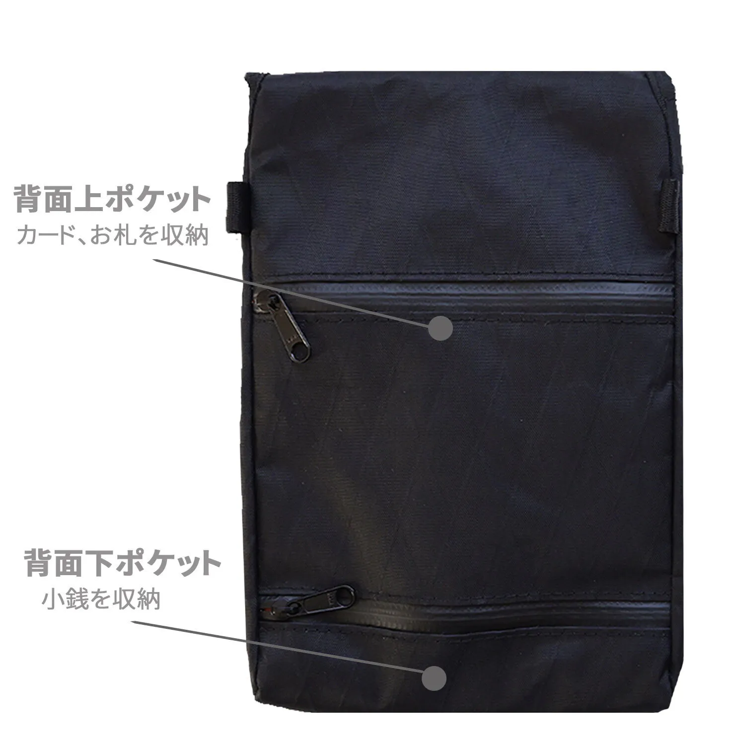 背面の上ポケットには、メッシュポケットがあり、カード、お札が2つ折りで収納できます