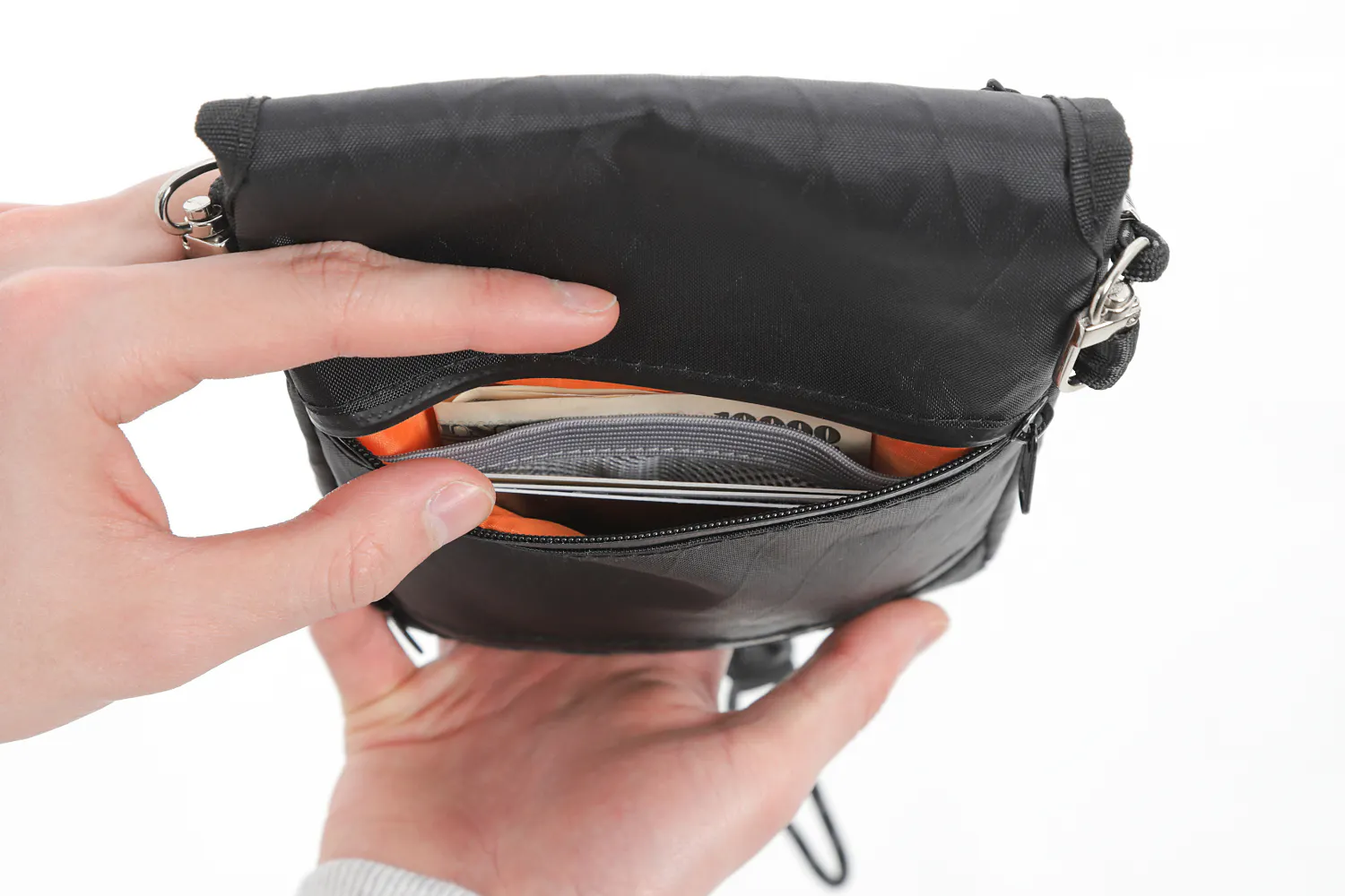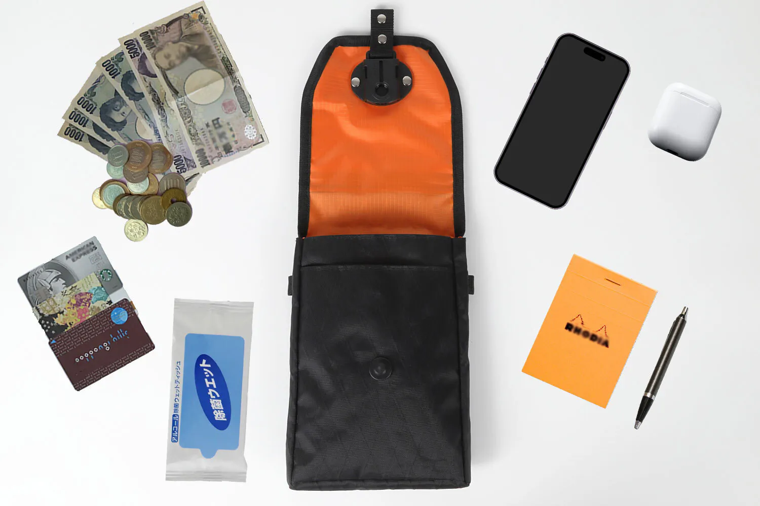 A: 基本的には財布がいらないポーチがコンセプトですが、 縦17cm横11cm厚さ3cm程度までの財布は入ります。*あまり厚みが出るとワンタッチで閉まりにくくなりますのでご注意ください。