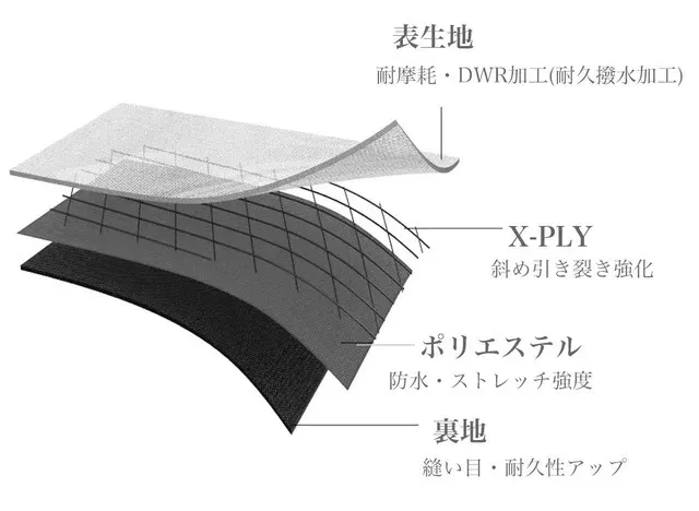 防水性と強度を向上させるために特殊な3層構造で構成されています。独特なダイヤ形状はX-PLYと呼ばれ、斜めの引き裂き強度を向上させています。