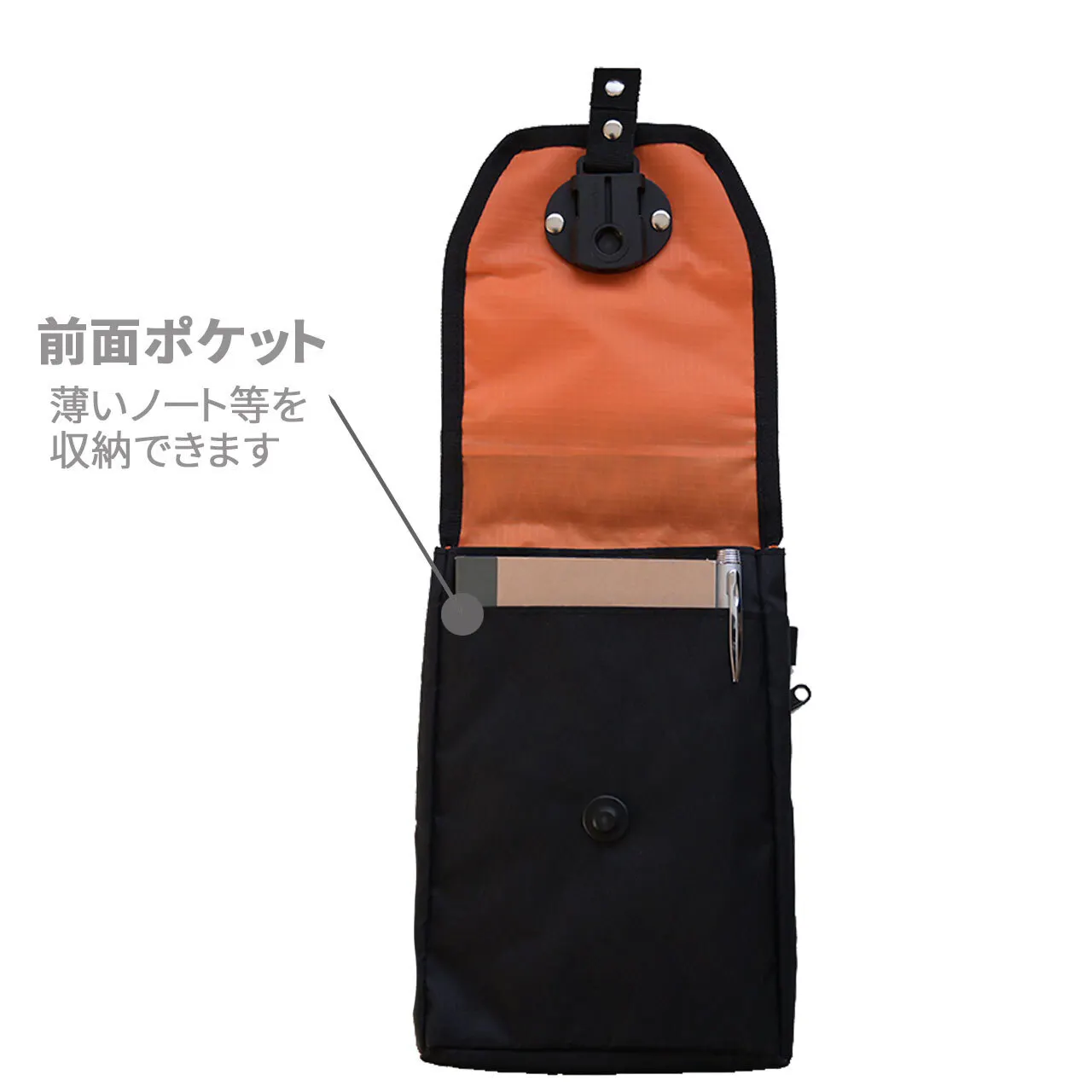 開閉時の前ポケットにはA6サイズのノート、ペン等の薄いものを収納できます