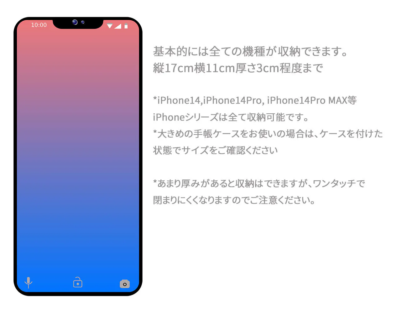 *iPhone14,iPhone14Pro, iPhone14Pro MAX等iPhoneシリーズは全て収納可能です。