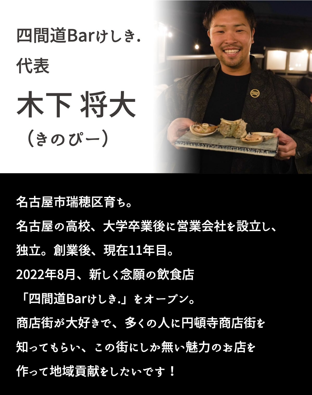 はじめまして、愛知県名古屋市西区の円頓寺(えんどうじ)商店街で「四間道BARけしき.」を運営している木下と申します。共同オーナーとして笠本康二と一緒にお店を経営しています。