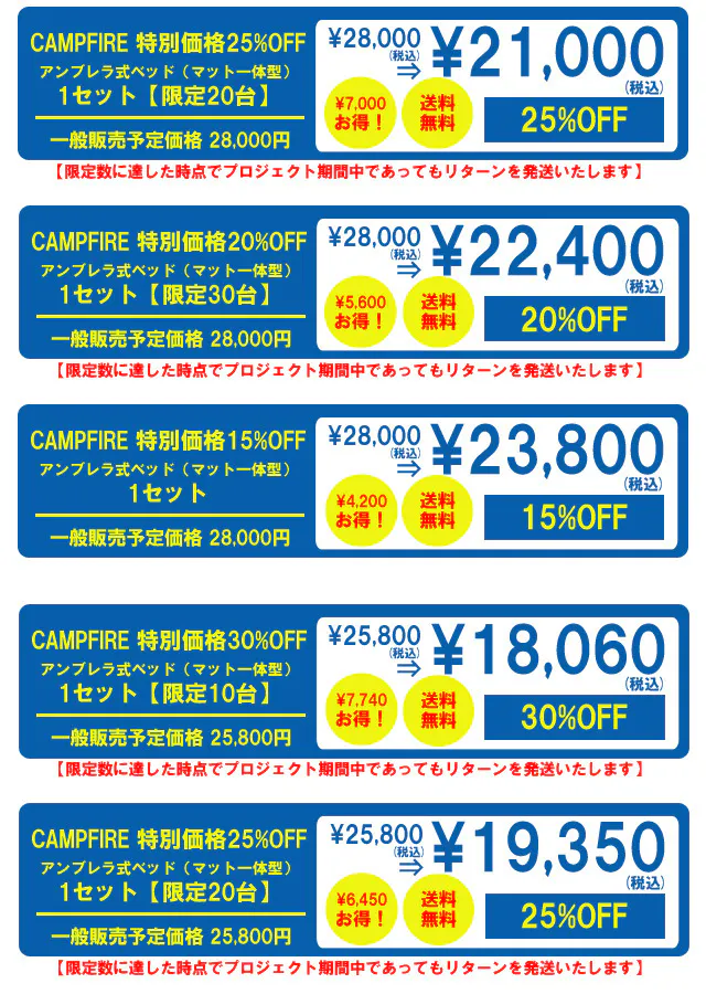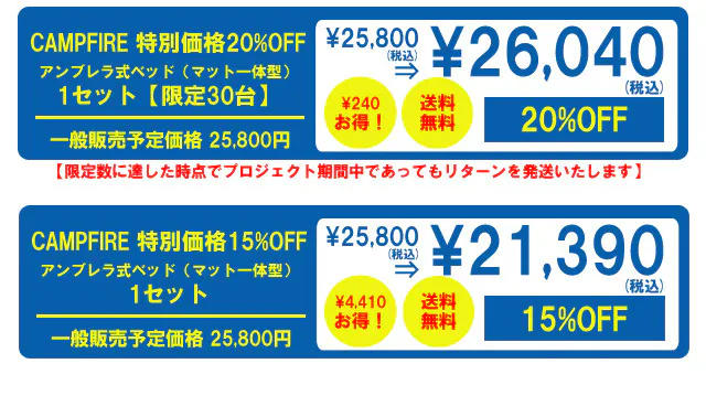 A:アンブレラ式ベッドマット一体型の一般販売につきましては、CAMPFIREからお申込み頂きました方へのリターン納品完了後に実施をする予定にしております。特別価格にてご入手いただけるこの機会に是非ご支援下さい。
