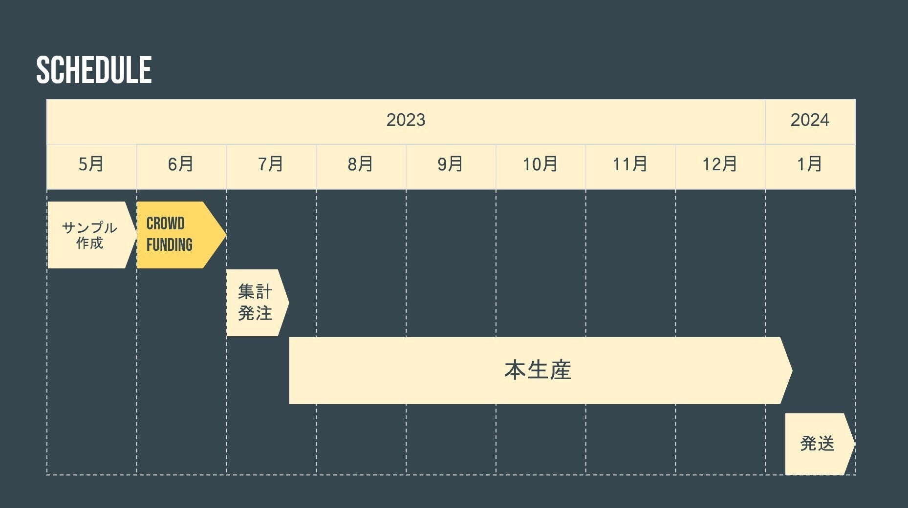 以下のスケジュールで進行しています。クラウドファンディング完了後、7月に発注、気温も低い頃の2024年1月に配送を予定しています。